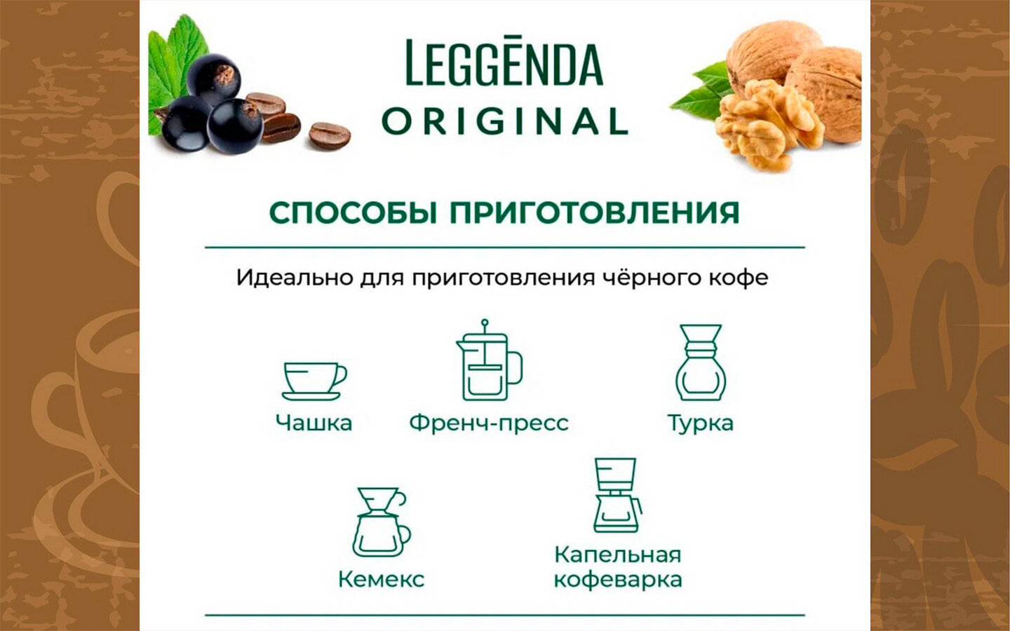| Способ заваривания | гейзерная кофеварка (мока), джезва, пуровер, френч-пресс, чашка, эспрессо |