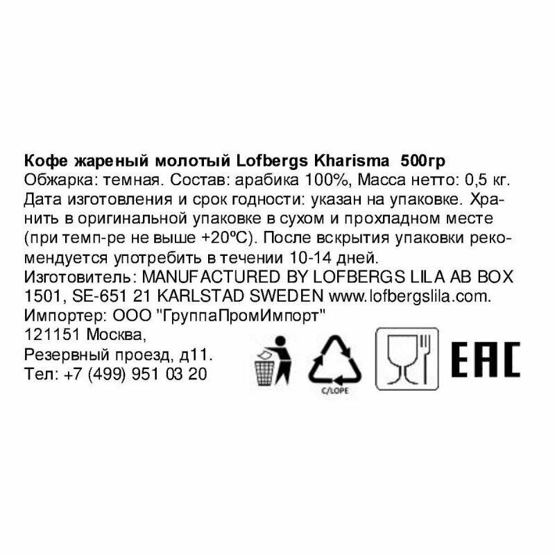 Кофе молотый арабика Lofbergs Kharisma (Обжарка №4), 500 гр. Швеция