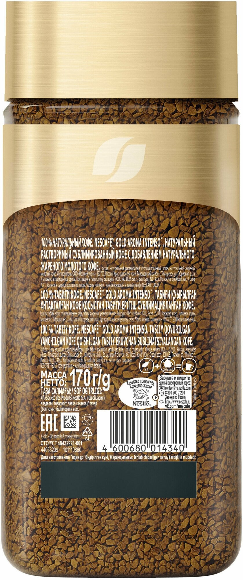 NESCAFÉ GOLD Aroma Intenso. Натуральный растворимый сублимированный кофе с добавлением натурального жареного молотого кофе, 170гр банка