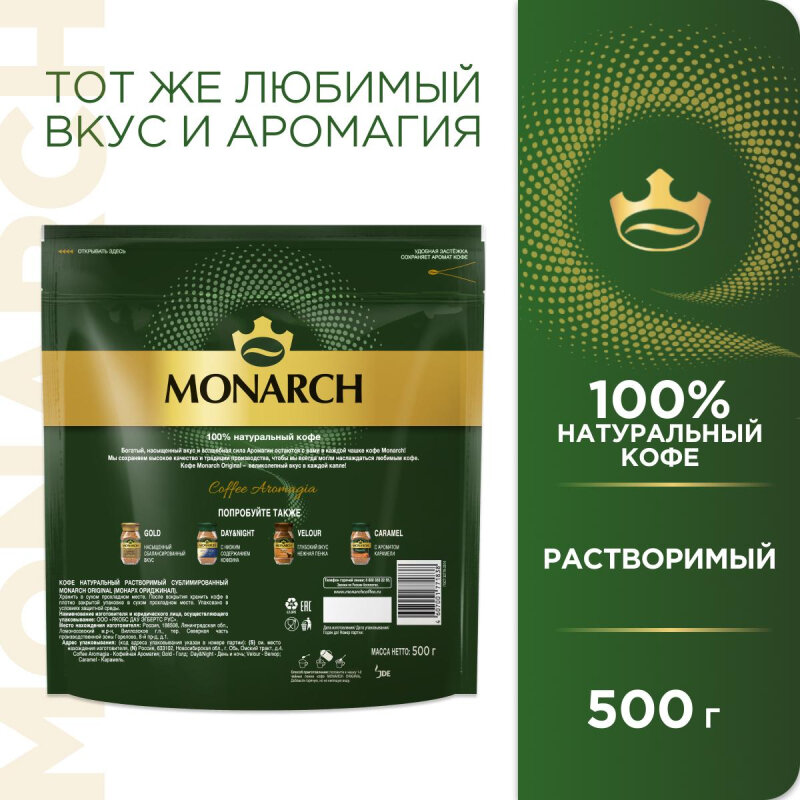 Кофе растворимый MONARCH Original, сублимированный, 500 г, мягкая упаковка, 8052130