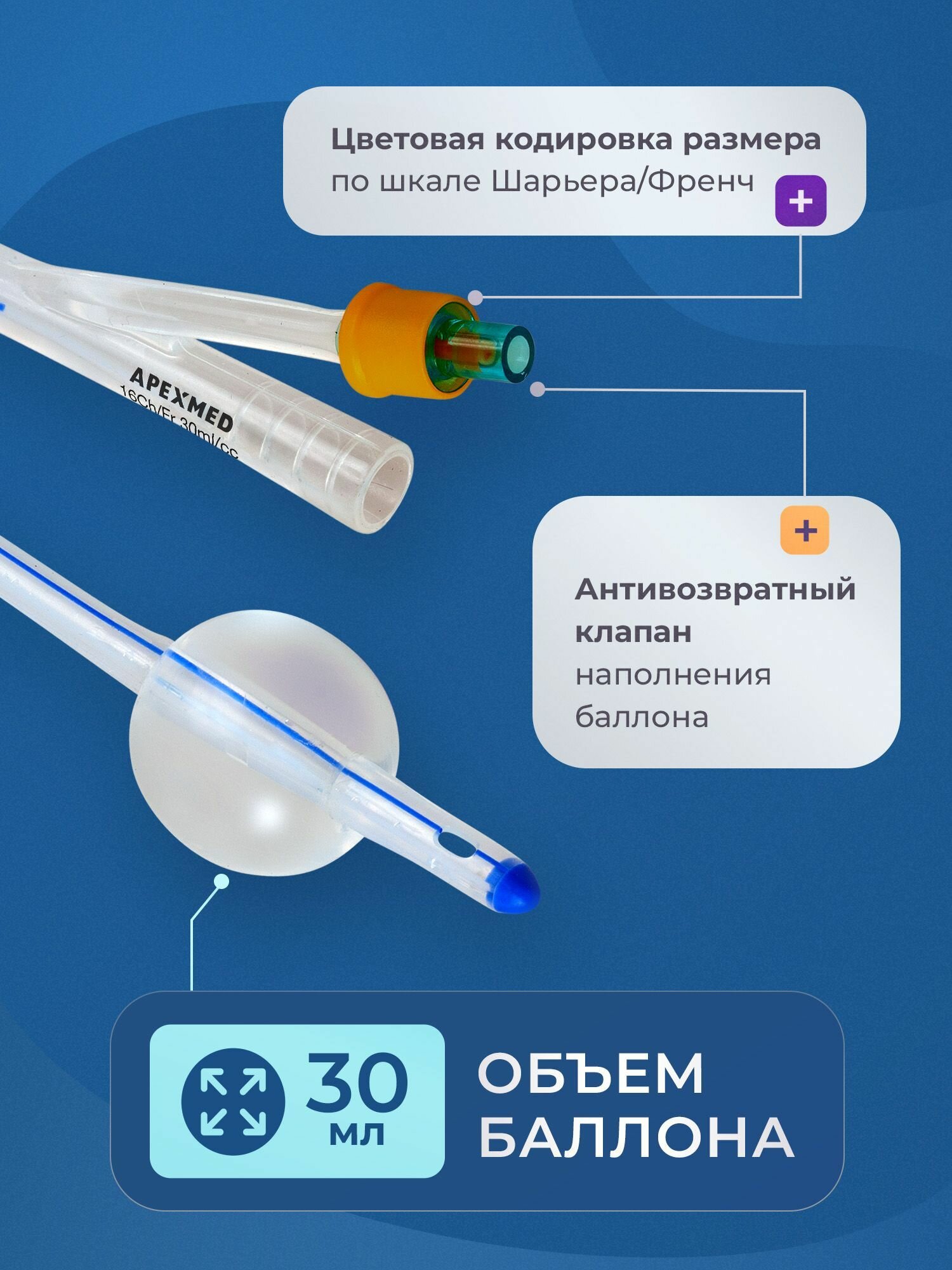 APEXMED Катетер Фолея урологический универсальный, мужской Ch/Fr 16, двухходовой, силиконовый, 10 шт, уретральный интересное: