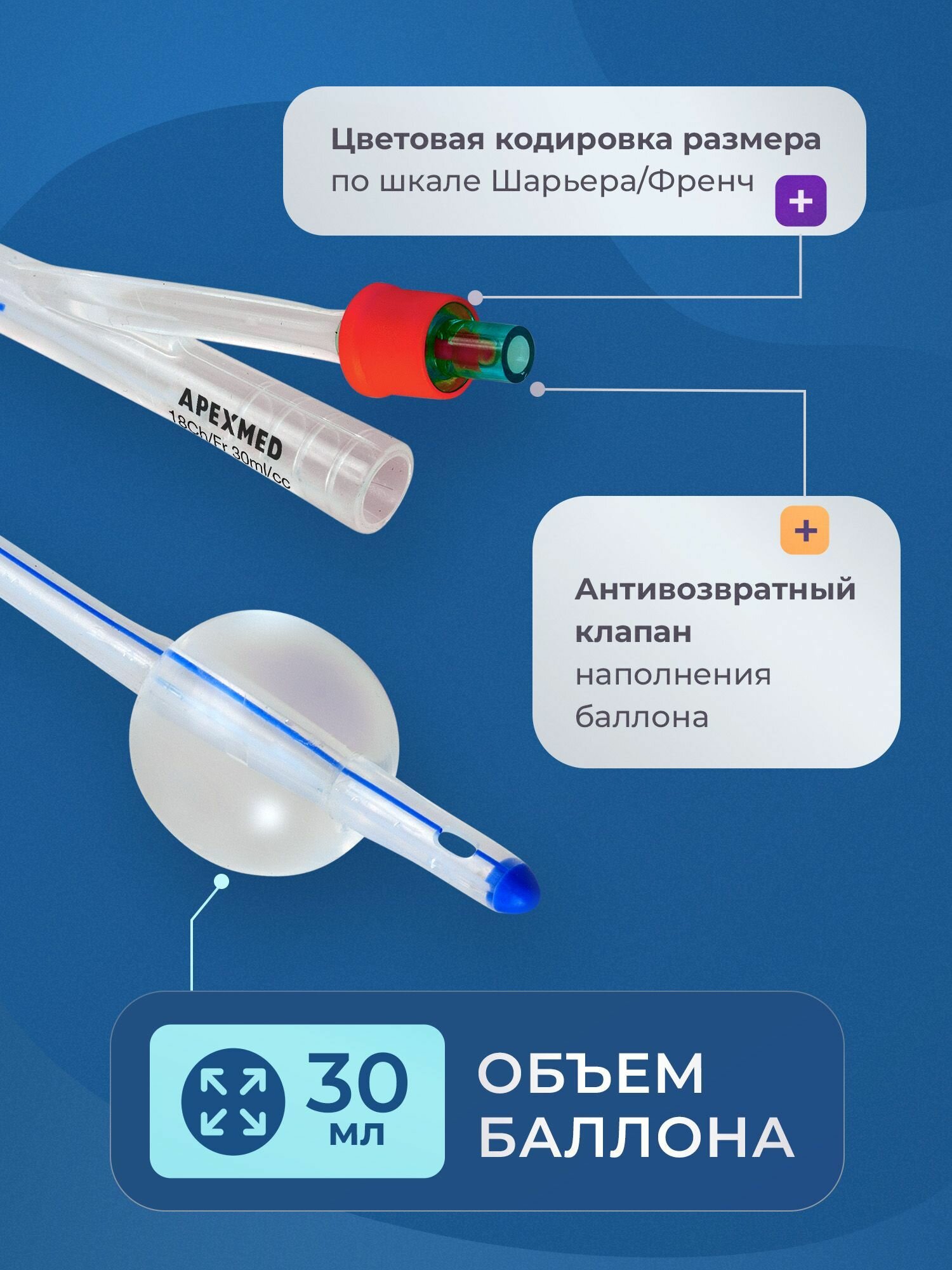 Катетер урологический Фолея Apexmed женский, Ch/Fr 18, двухходовой, силиконовый