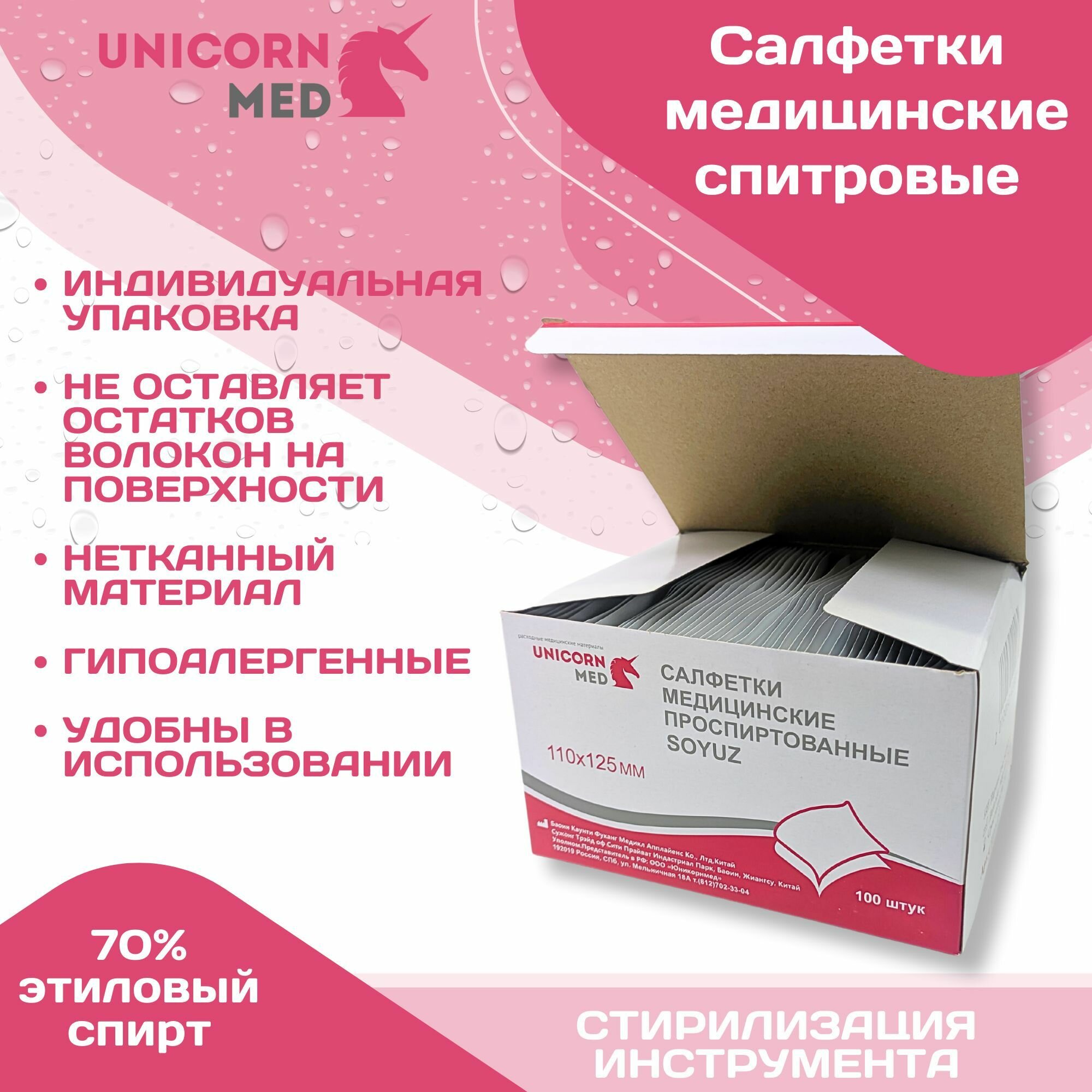 СохранитьСпиртовые салфетки Unicorn Med SOYUZ, для инъекций, размер 110x125, 100 штук интересное: