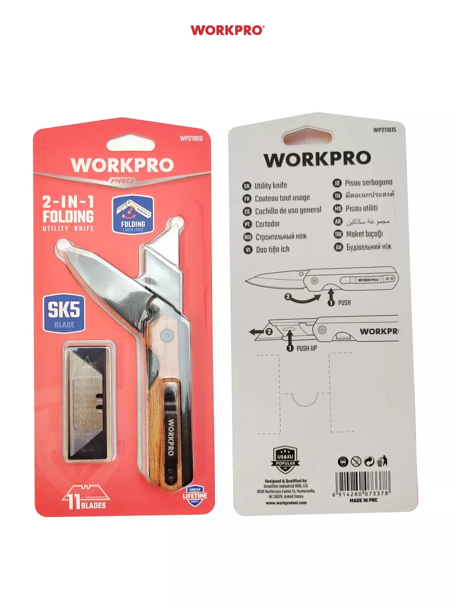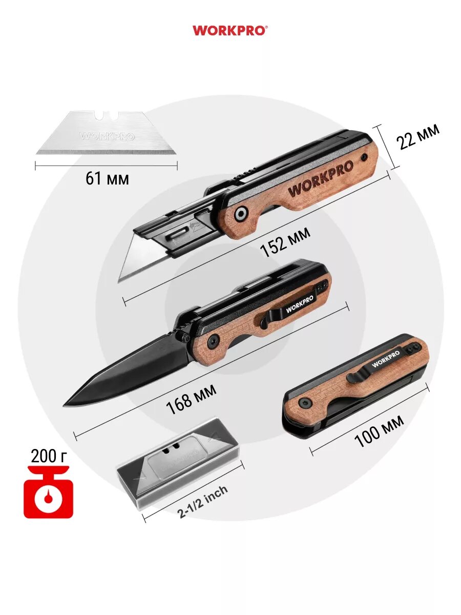 | Подробная комплектация | Складной нож WORKPRO ручка из дерева 10 лезвий |
