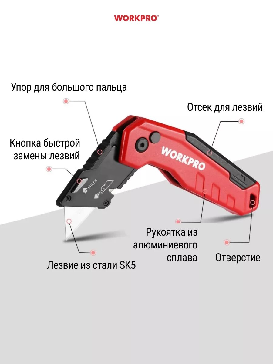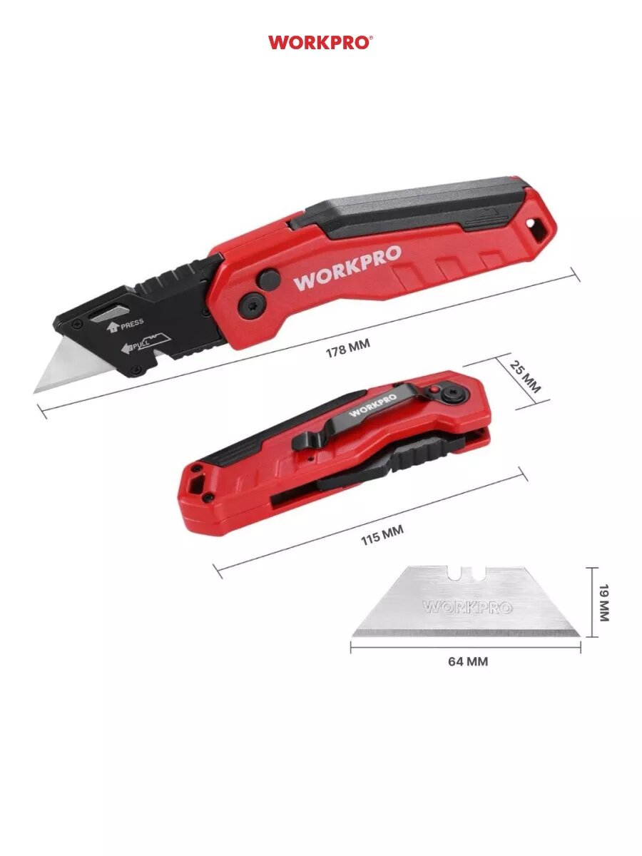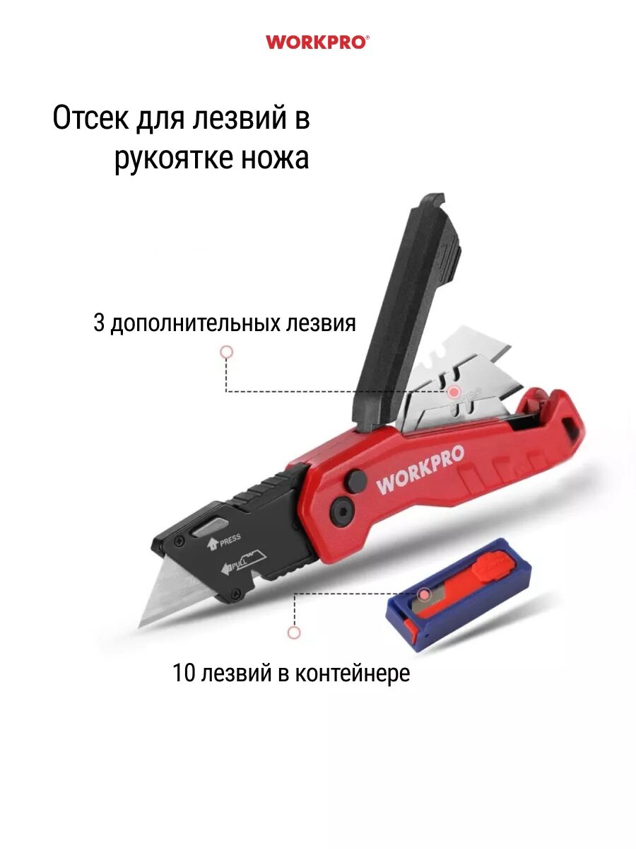 Нож складной универсальный + 10 лезвий WP211018, WORKPRO #WP211018