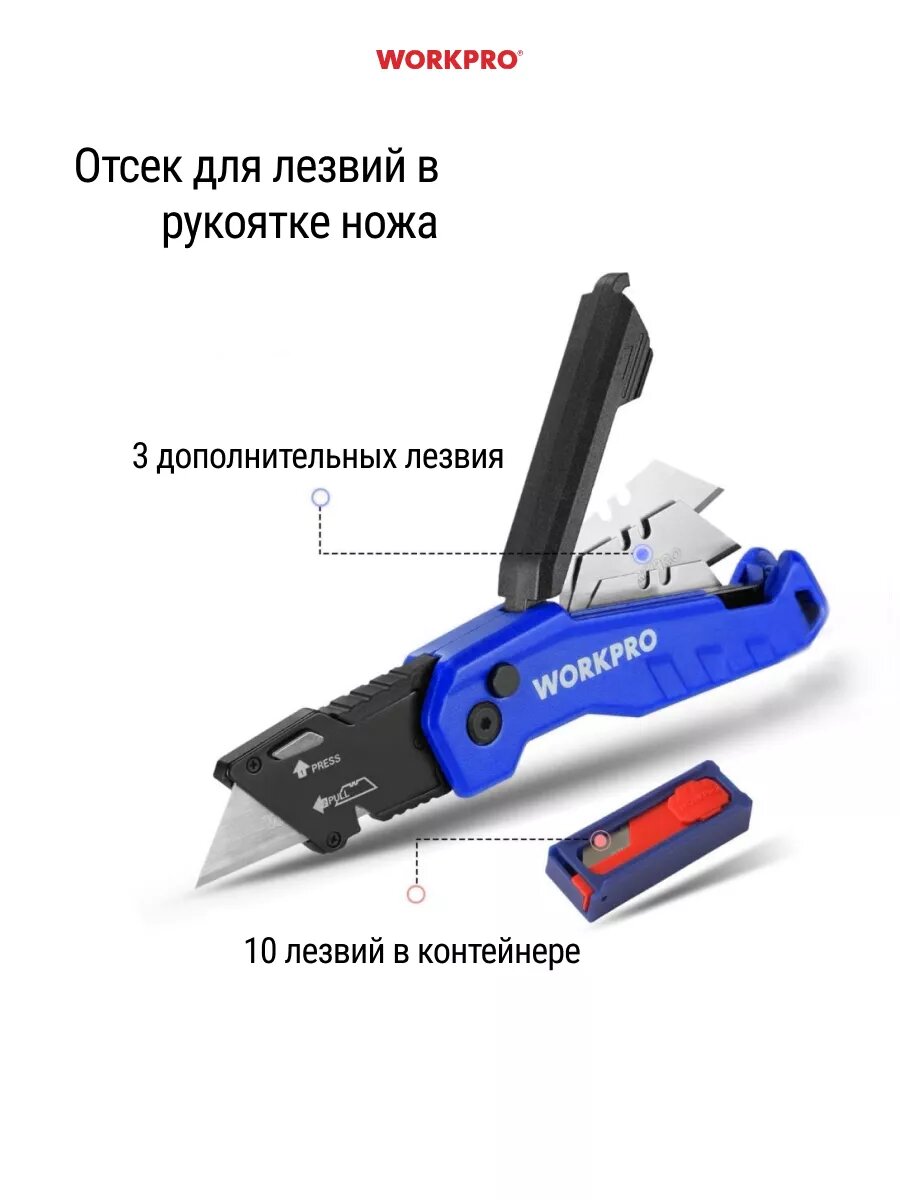 Нож складной универсальный + 10 лезвий WP211018, WORKPRO #WP211018