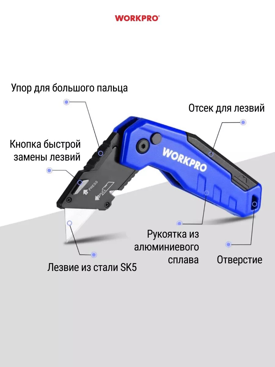 Нож универсальный строительный складной со сменным лезвием WORKPRO WP211007