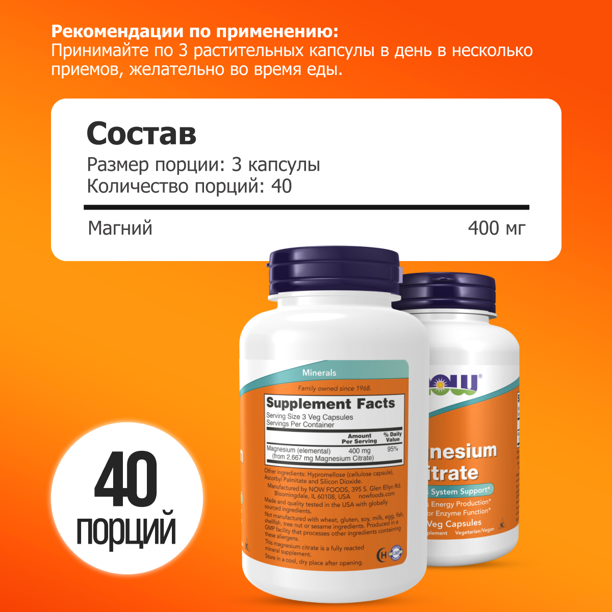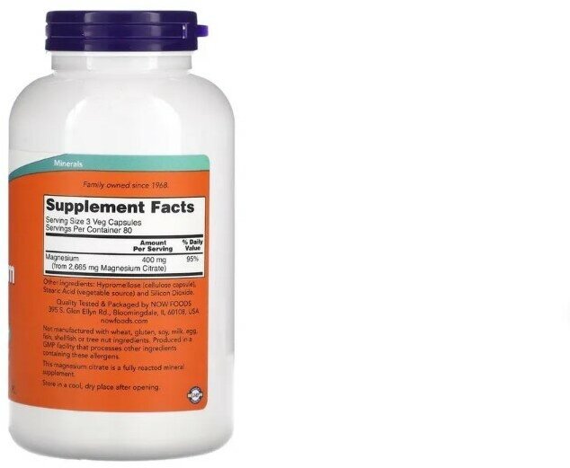 | Комплектация | NOW Foods, Magnesium Citrate, цитрат магния, 120 вегетарианских капсул - 1 банка |