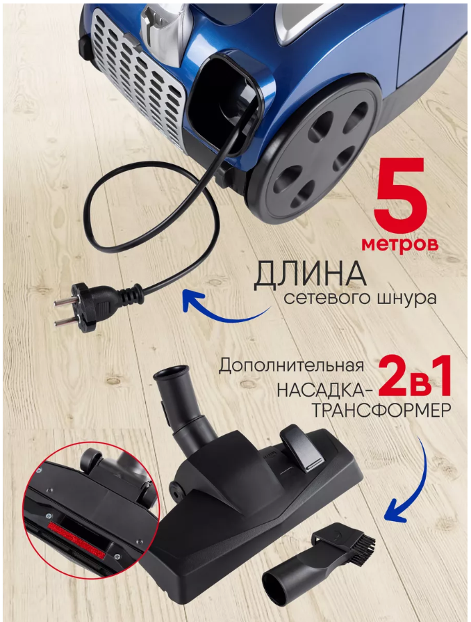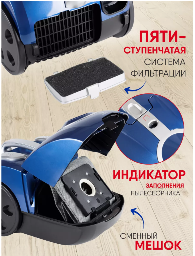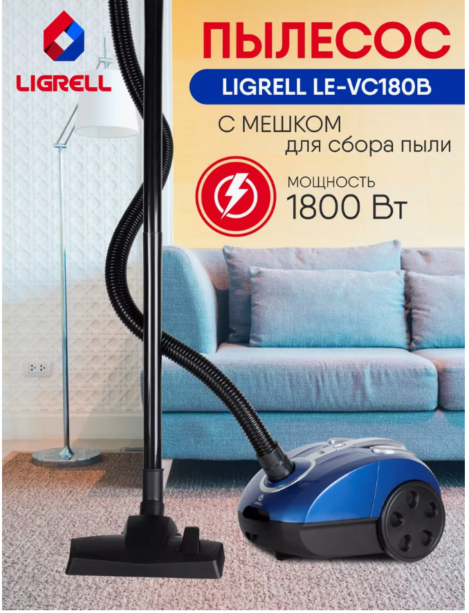 Пылесос Ligrell LE-VC180B, мощность 1800 Вт., объем пылесборника 2 л., пятиступенчатая система фильтрации, cиний