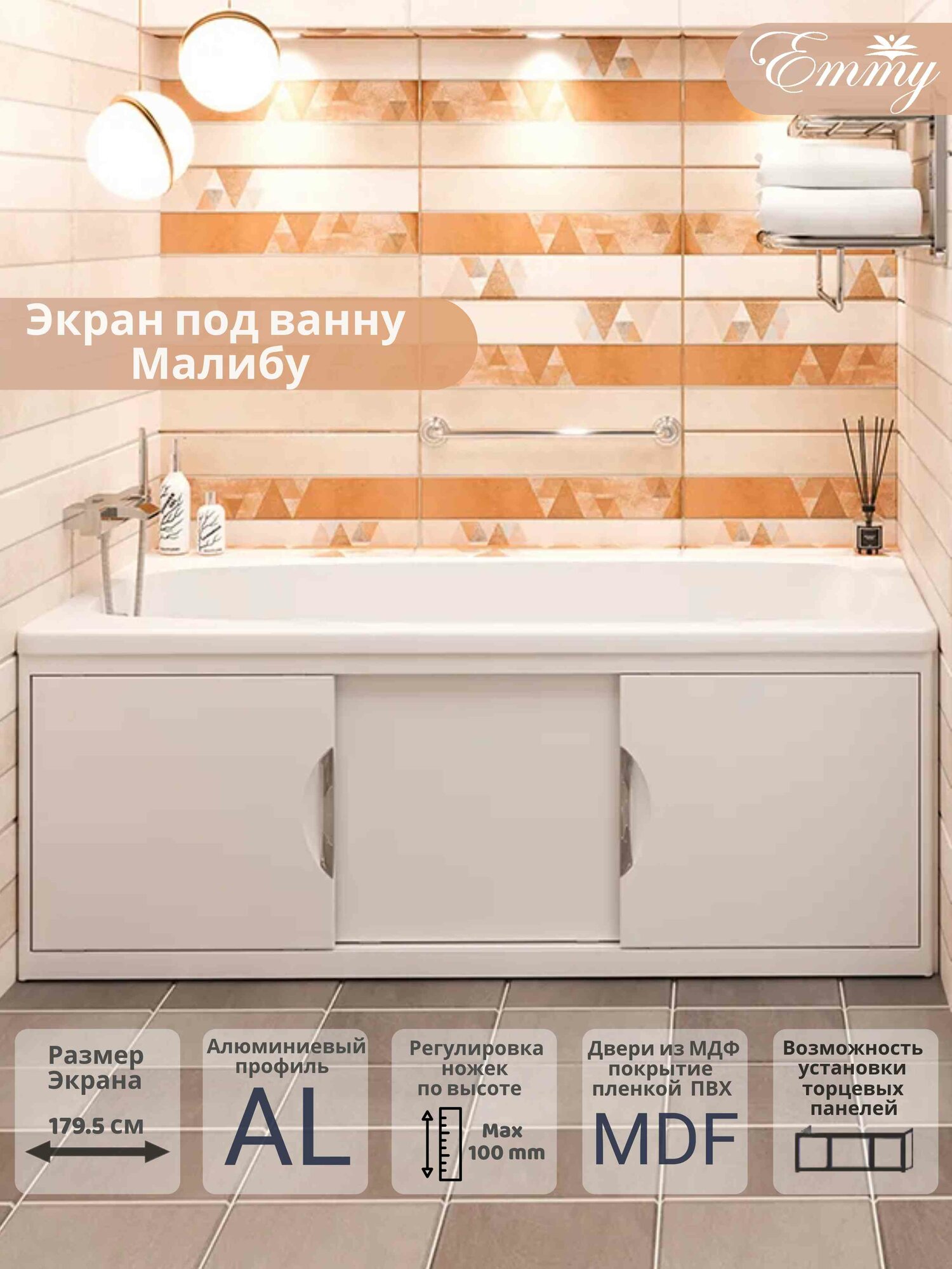 Ниже Вы можете прочитать отзывы на Экран для ванны Emmy "Малибу 180" белый, с раздвижными дверцами МДФ, каркас алюминиевый профиль, ознакомится с подробными характеристиками, посмотреть интересные обзоры и фотографии на Экран для ванны Emmy "Малибу 180" белый, с раздвижными дверцами МДФ, каркас алюминиевый профиль.