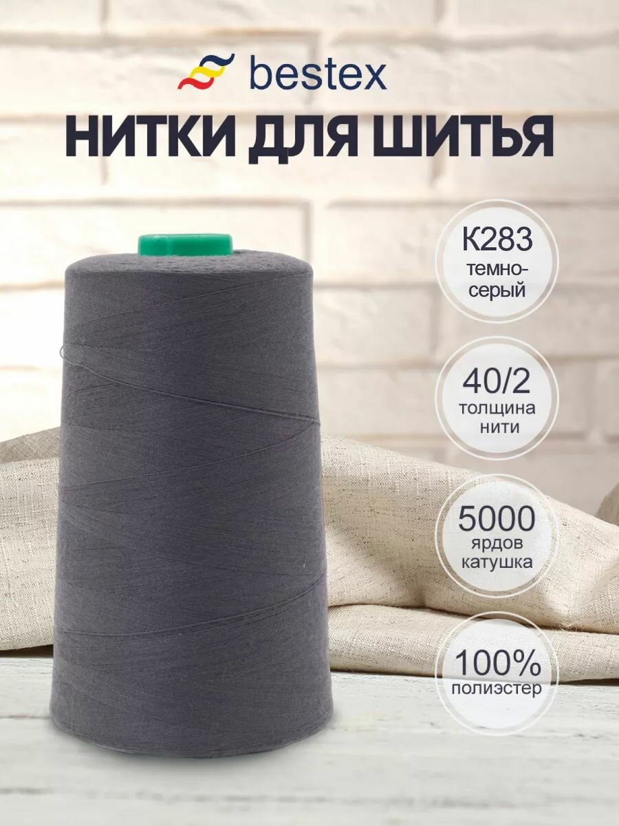 Купить Нитки швейные универсальные 40/2, 5000 ярд, промышленные, Bestex (К283 тёмно-серый)