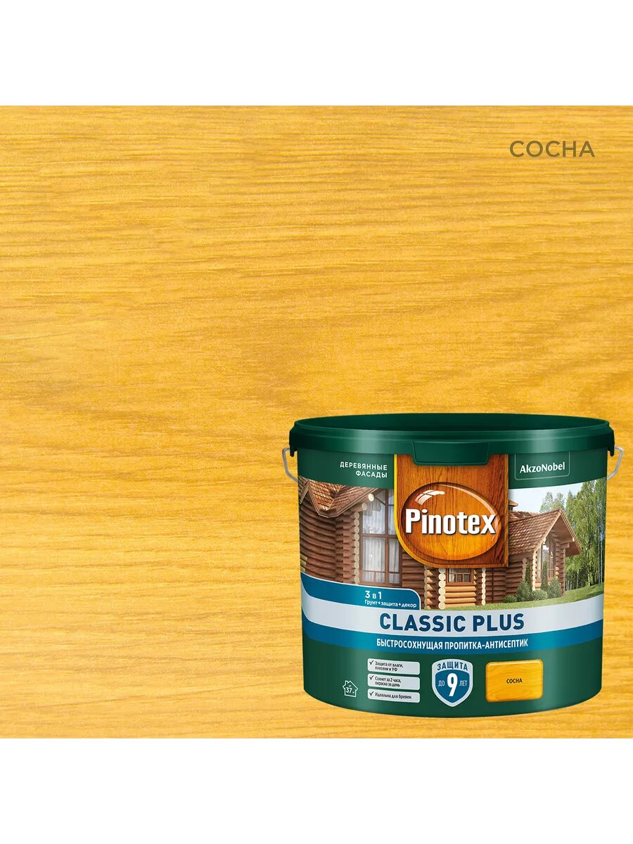 PINOTEX CLASSIC PLUS пропитка-антисептик быстросохнущая 3 в 1 ель натуральная 9л