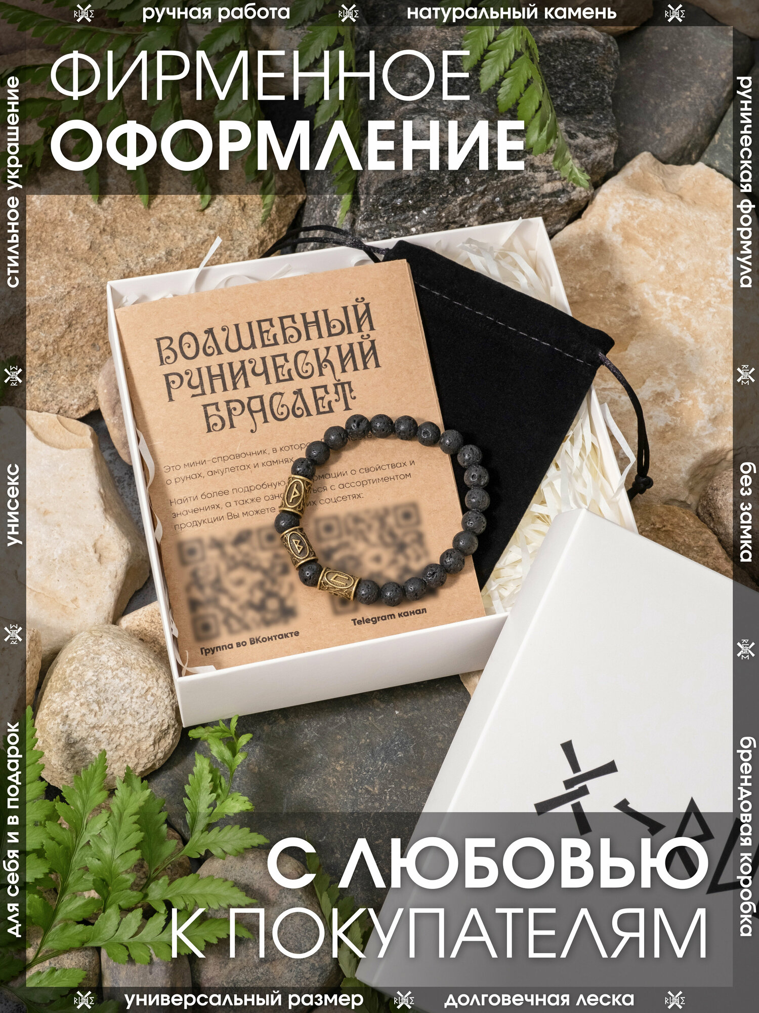 Браслет из натурального камня Лава (базальт)/Руническая формула защиты здоровья/Чёрный браслет-оберег, бижутерия