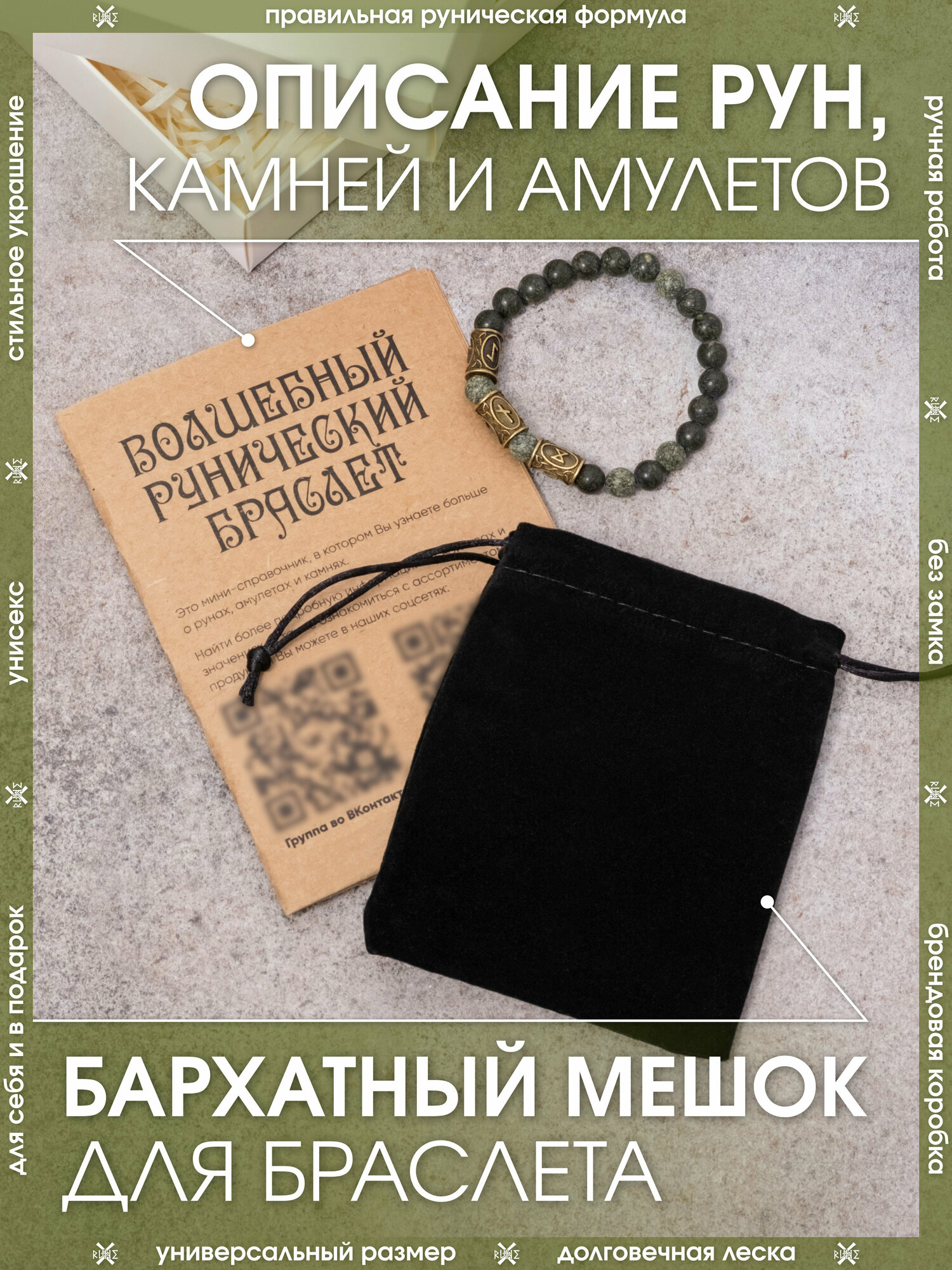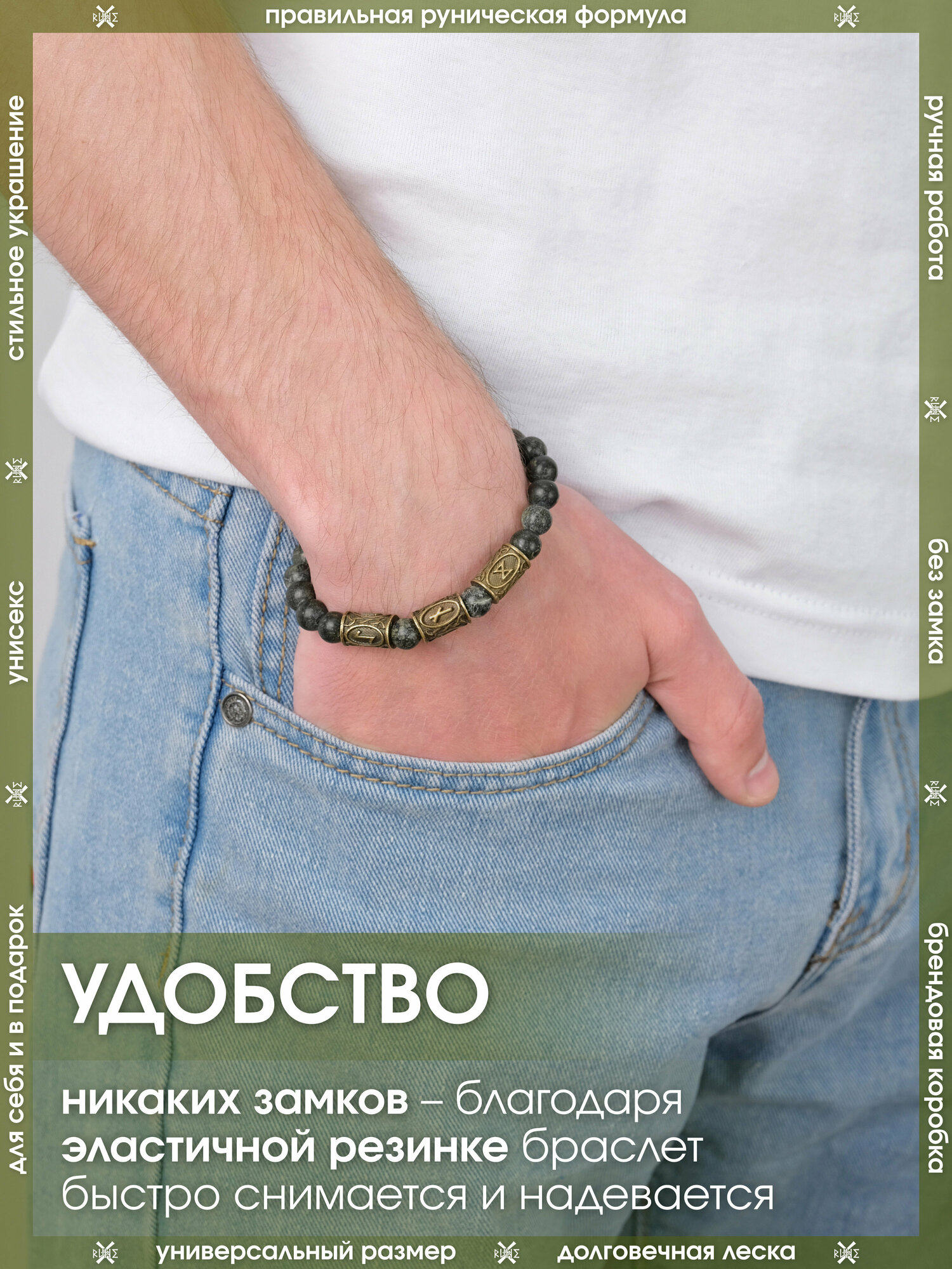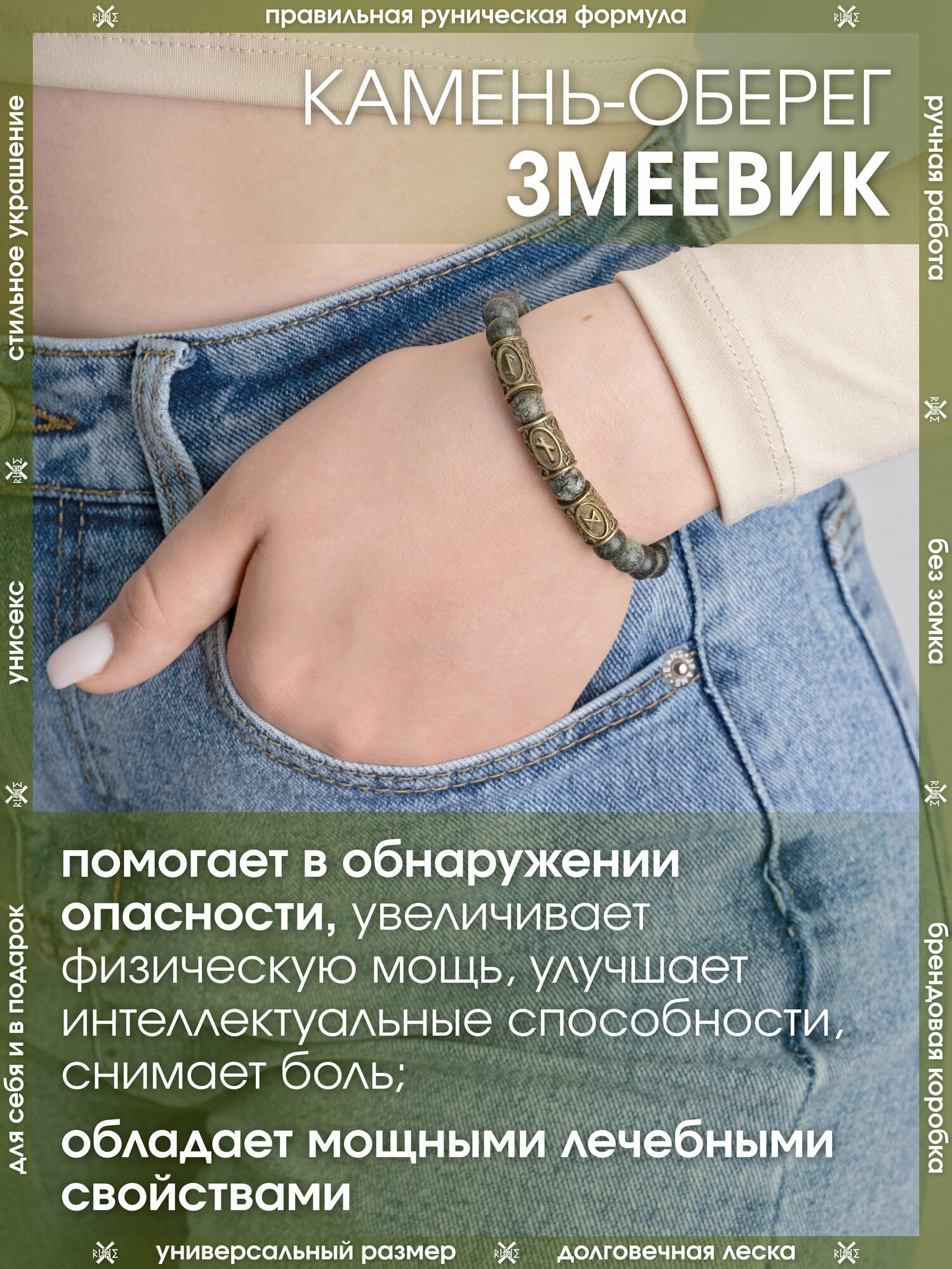 Браслет из натуральный камней/Оберег на руку из унакита/Талисман-амулет с рунами женский, мужской/Украшение из бусин