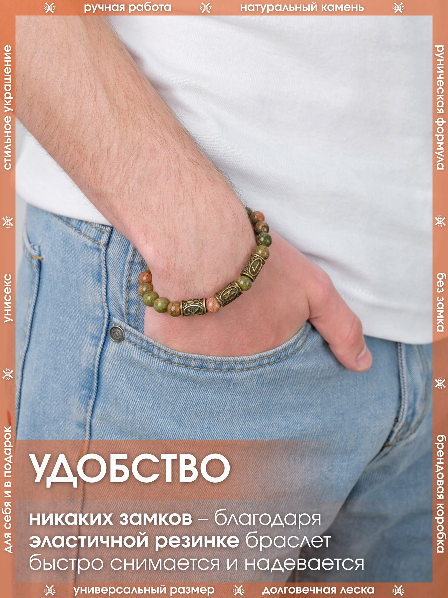 Браслет из натуральный камней/Оберег на руку из унакита/Талисман-амулет с рунами женский, мужской/Украшение из бусин