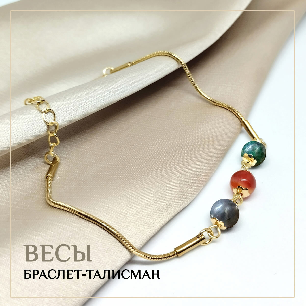 Браслет талисман по зодиаку Весы. Позолота, натуральные камни: Азурмалахит, Сердолик, Лабрадор.
