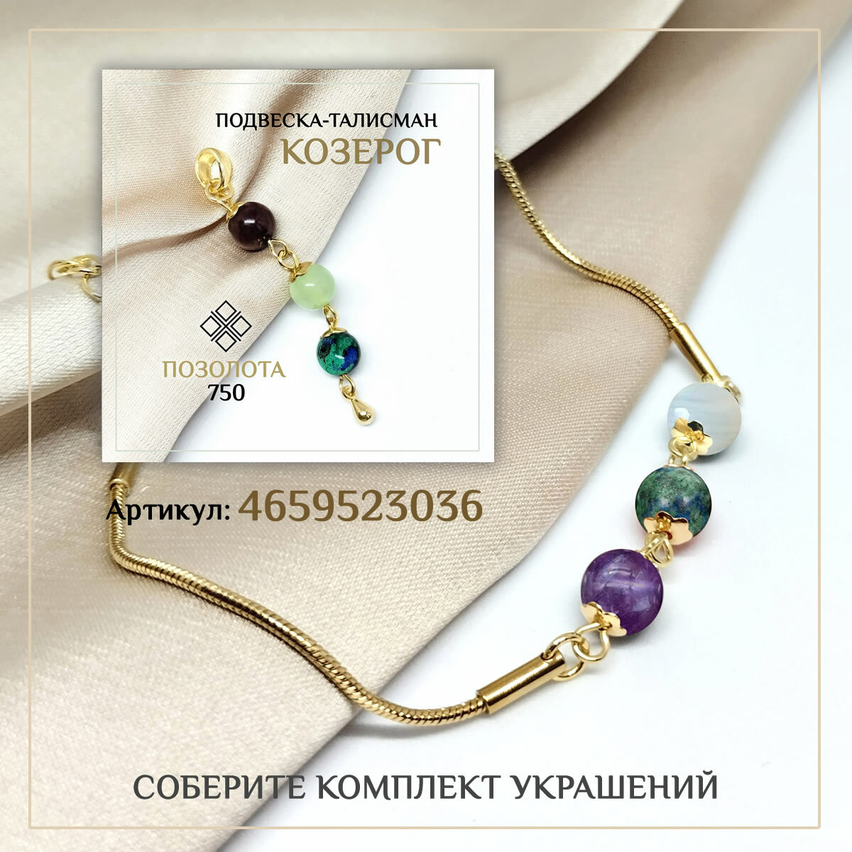 Браслет талисман по зодиаку Козерог. Позолота, натуральные камни: Азурмалахит, Аметист, Агат белый