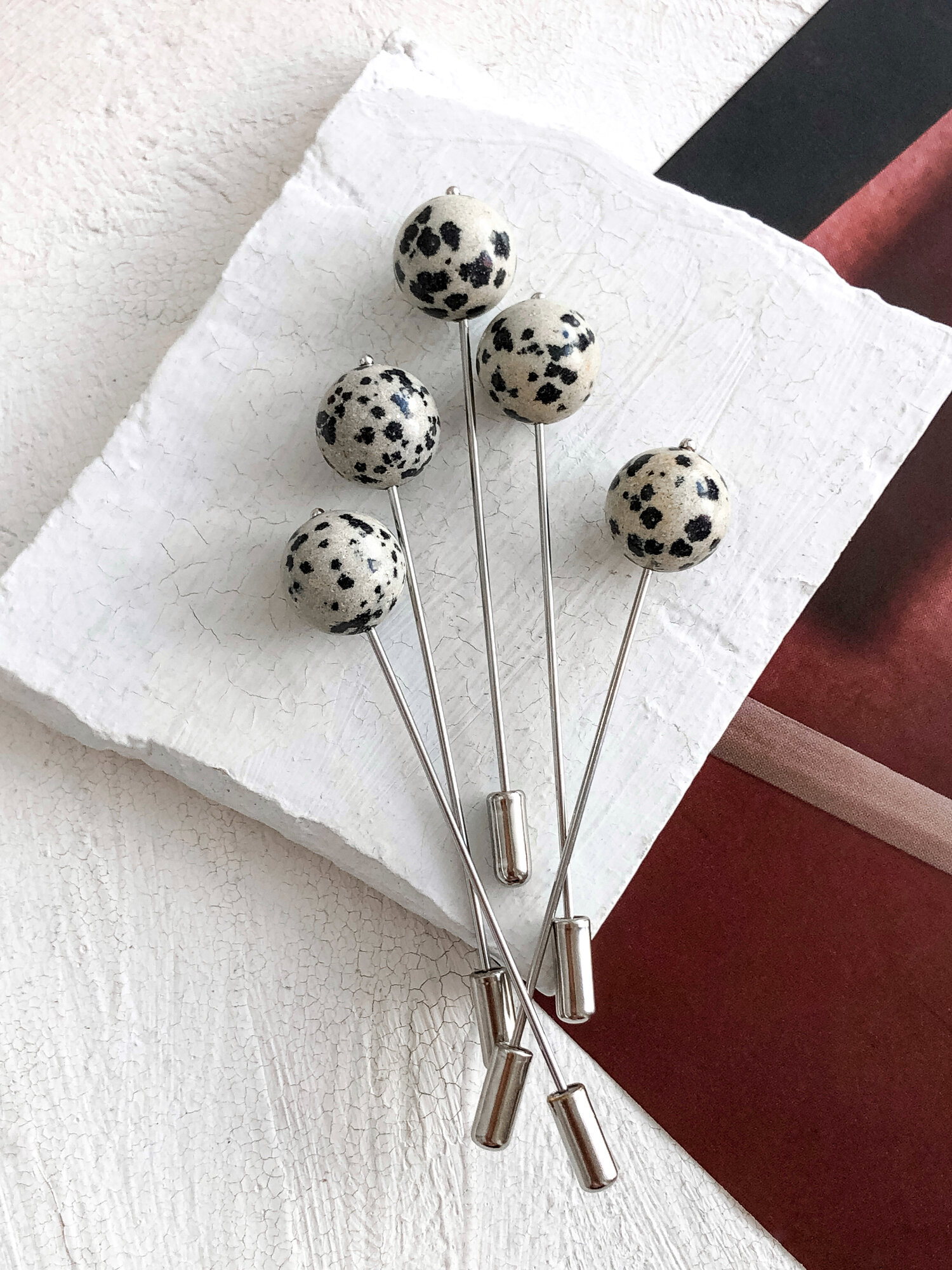 Брошь булавка оникс, яшма Далматиновая (диорит)