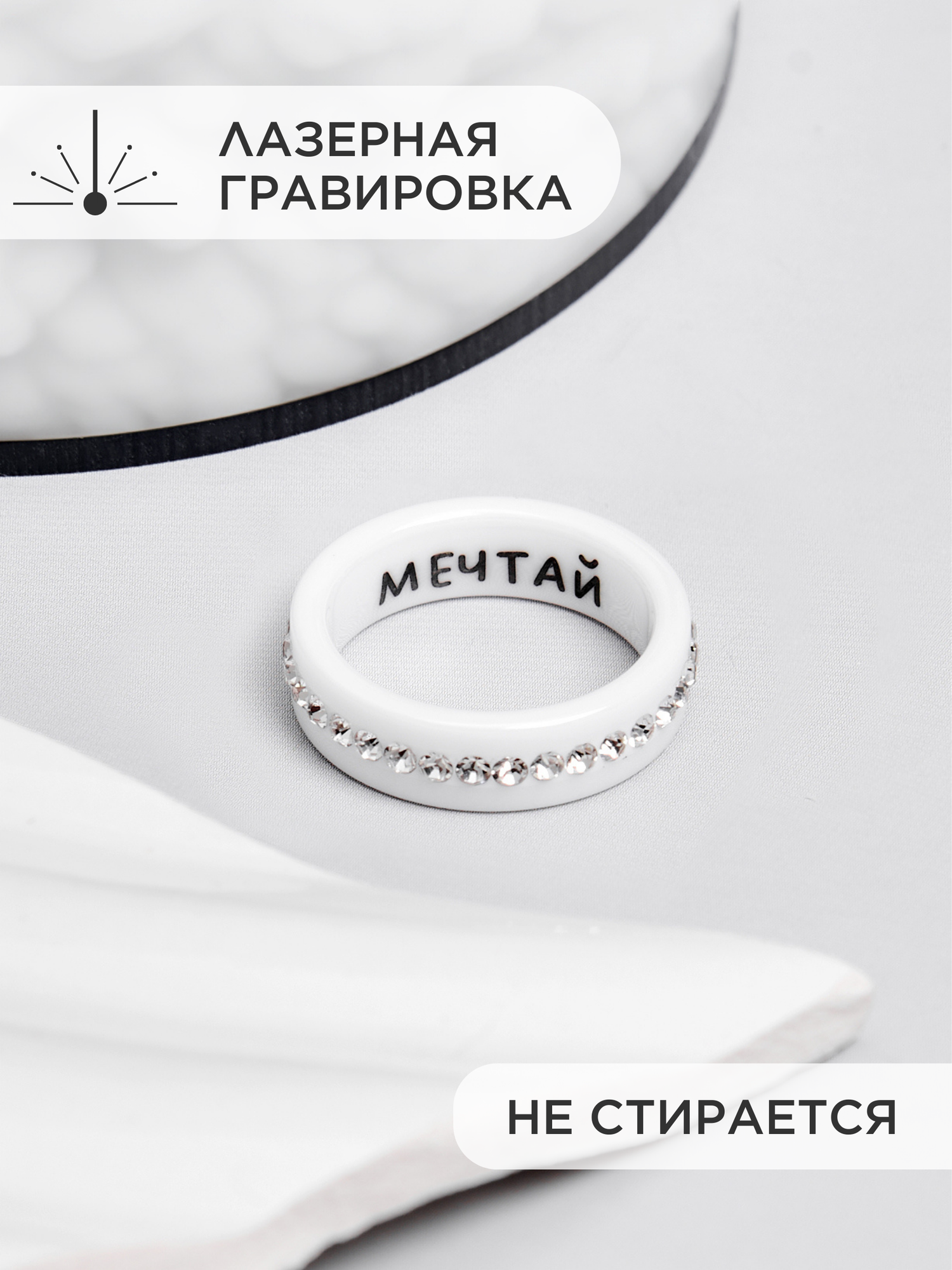 Кольцо бижутерия женское из белой керамики с гравировкой 17 размер