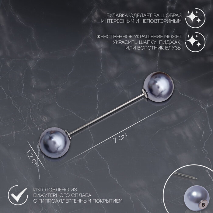 Булавка "Две жемчужины", 7 см, цвет серый в серебре