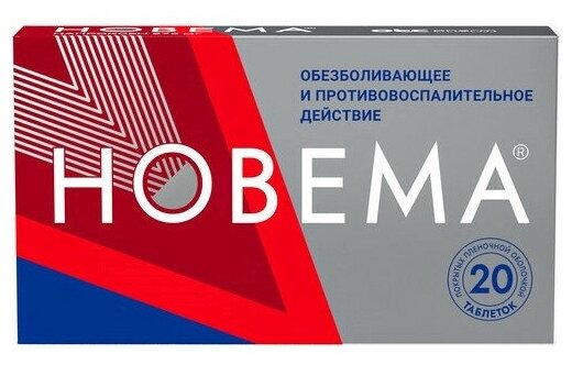 | Показания к применению | Заболевания опорно-двигательного аппарата (ревматическое поражение мягких тканей, остеоартроз периферических суставов и позвоночника, в том числе с радикулярным синдромом, тендовагинит, бурсит).Болевой синдром слабой или умеренной степени выраженности: невралгия, оссалгия, миалгия, люмбоишиалгия, посттравматический болевой синдром (растяжения и ушибы), сопровождающийся воспалением, головная боль, мигрень, альгодисменорея, зубная боль.В составе комплексной терапии инфекционно-воспалительных заболеваний уха, горла, носа с выраженным болевым синдромом (фарингит, тонзиллит, отит).Лихорадочный синдром при "простудных" и инфекционных заболеваниях.Препарат Новема применяется для симптоматической терапии (для уменьшения боли, воспаления и снижения повышенной температуры тела) и на прогрессирование основного заболевания не влияет. |