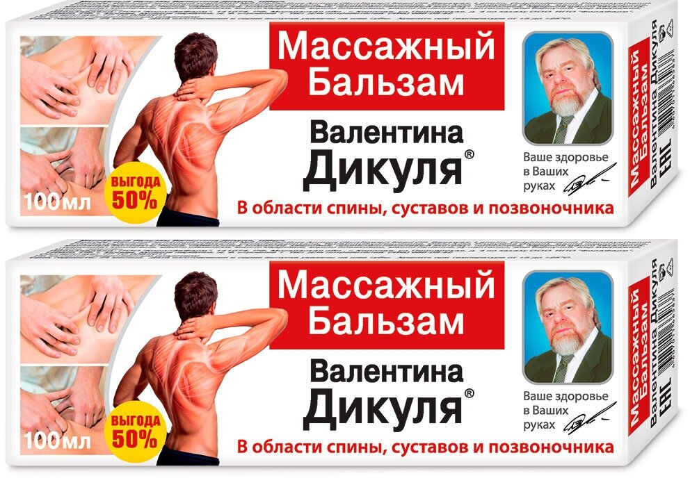 | Комплектация | Массажный бальзам Валентина Дикуля В области спины, суставов и позвоночника 100 мл 2 штуки |