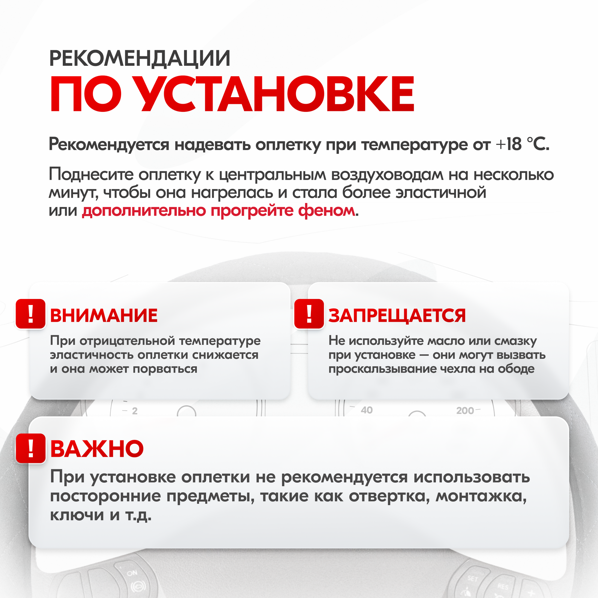 | Дополнительная информация | Рекомендации производителей: выбирайте оплётку под размер вашего рулевого колеса. Неверно выбранный размер может стать причиной проскальзывания оплётки, привести к невозможности снять или надеть её на руль. |