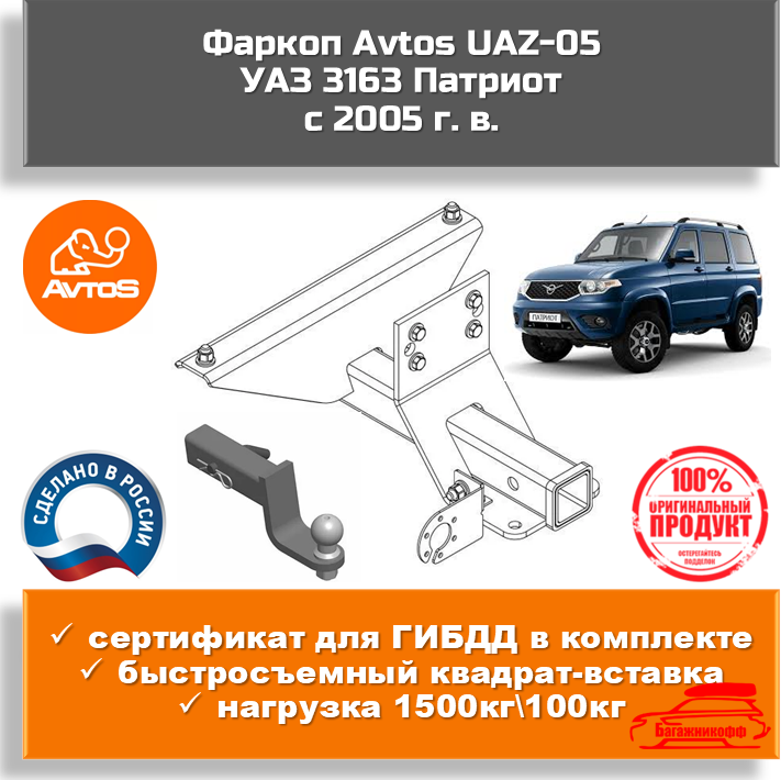 Фаркоп AvtoS UAZ-05 УАЗ 3163 Патриот с 2005 г. (американский квадрат) (вадрат/вставка, паспорт и сертификат в комплекте) интересное: