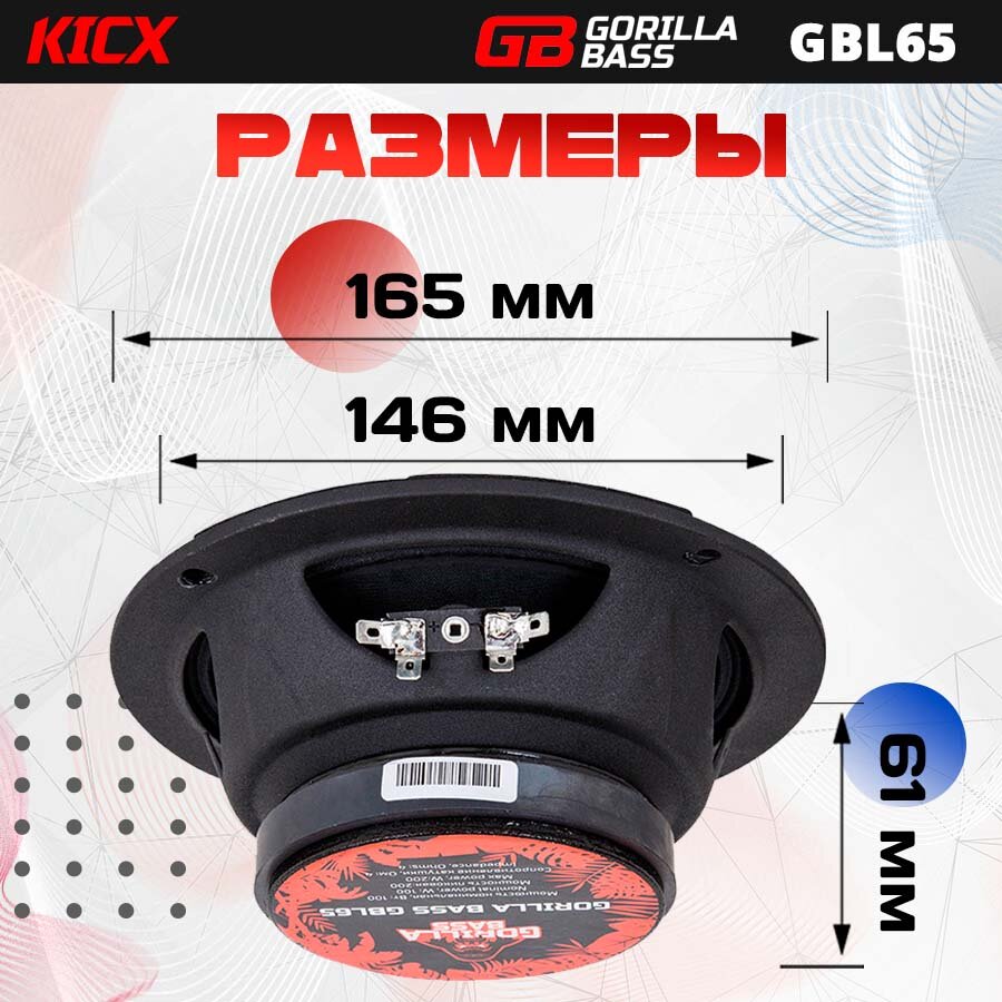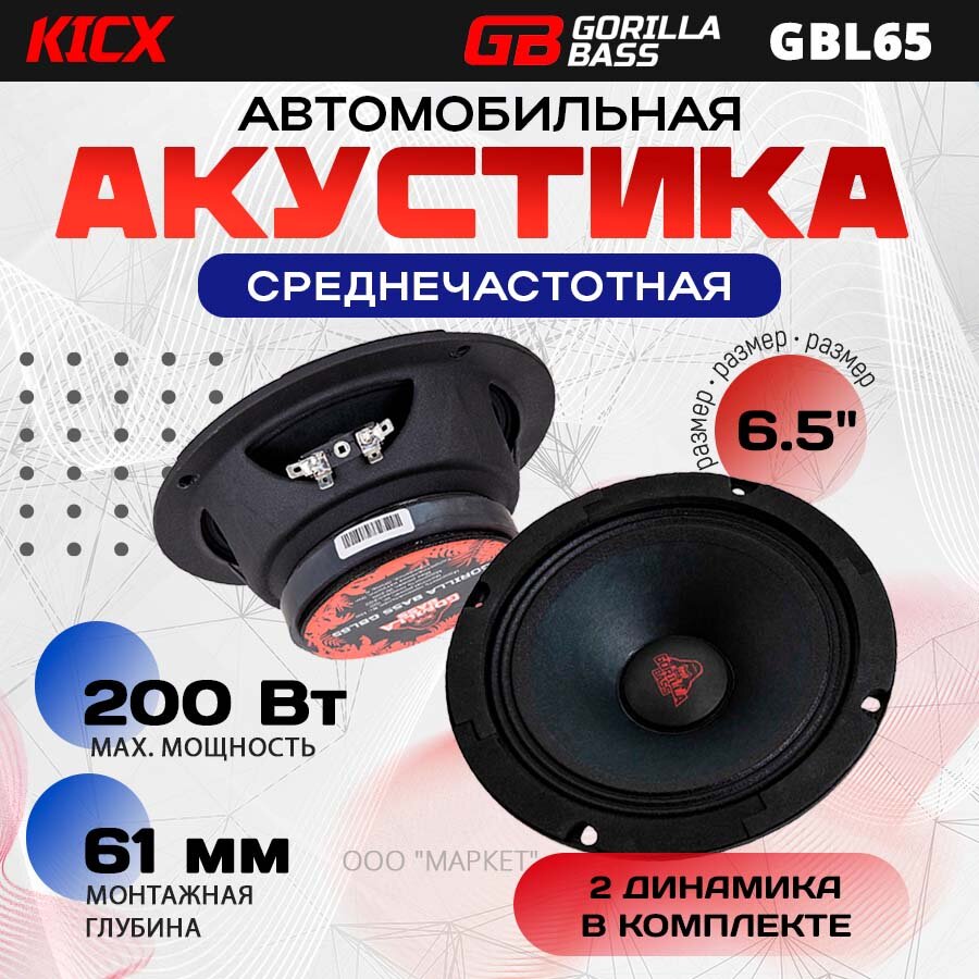 Акустика Kicx Gorilla Bass GBL65, мидбасс, 100/200 Вт, 6.5", 2шт. интересное: