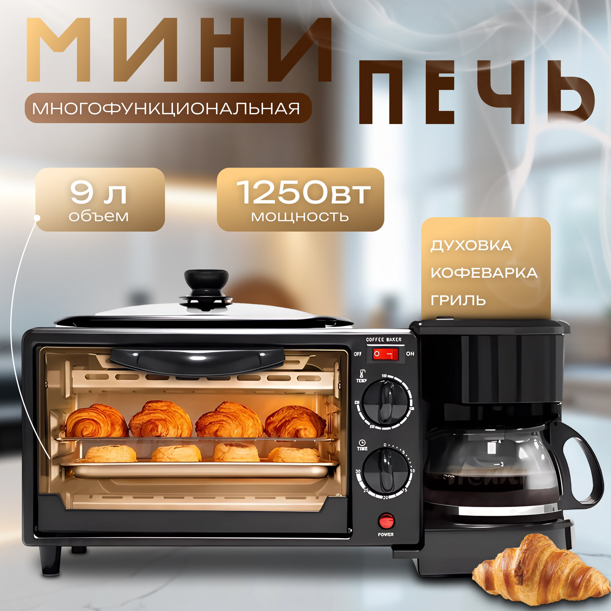 Многофункциональная электрическая мини-печь 3 в 1(духовка, кофеварка, гриль) черного цвета интересное: