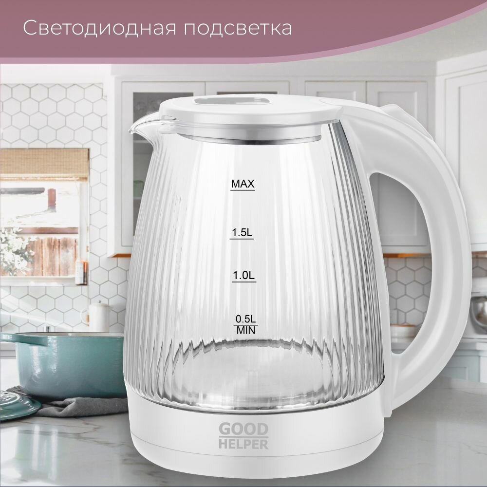 Чайник электр. GOODHELPER KG-20B20 (диск, 2л) 1,5кВт, стекло в рубчик, белый