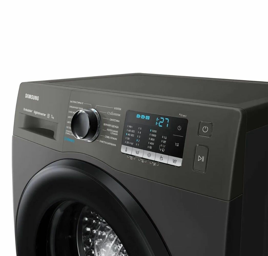 Узкая стиральная машина Samsung WW80AGAS21AXLP, 8 кг, с электронным управлением, инверторным мотором, технологией Eco Bubble, графит / черный