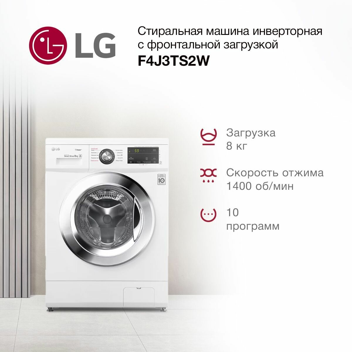 Стиральная машина LG F4J3TS2W 8 кг, с функцией пара, 6 вариантами вращения барабана, инверторным мотором с прямым приводом и 12 автоматическими программами, белая / серебристая