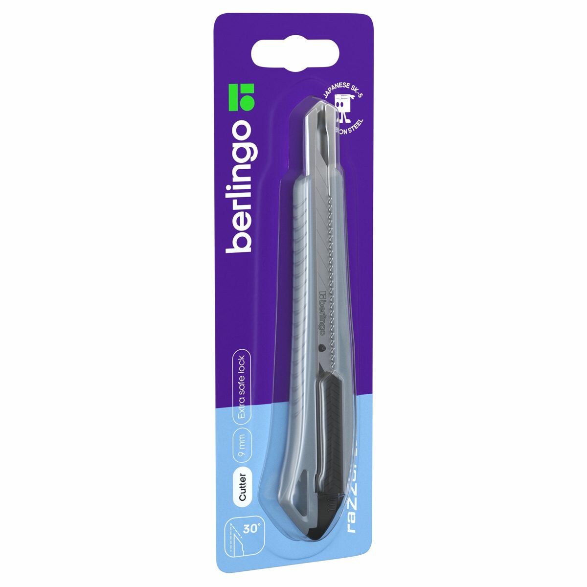 Нож канцелярский 9мм Berlingo Razzor 200, auto-lock, металл. направл, серый, европодвес (BM4127_d), 10 уп.