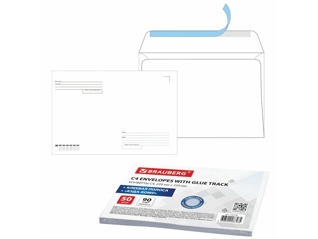 Конверт почтовый бумажный белый "С4" формата 229х324 мм с клеевым слоем, 90 г/м2, комплект/набор из 50 штук, Brauberg, внутренняя запечатка, 112178