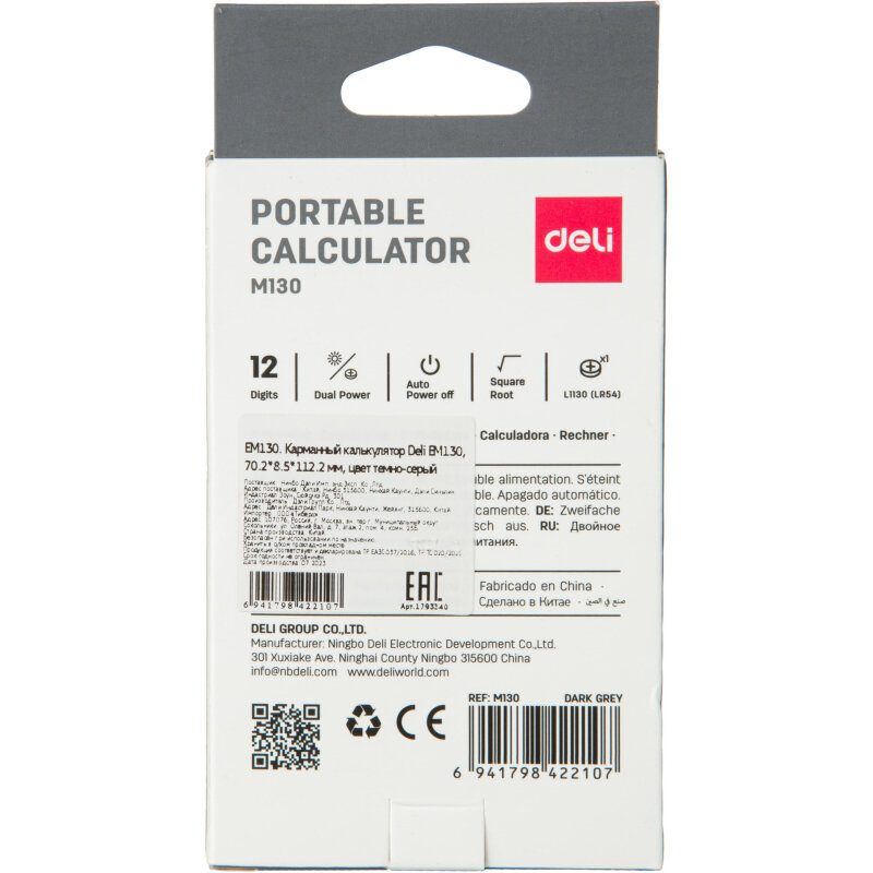 | Подробная комплектация | Калькулятор карманный Deli EM130, 12-р,дв.пит.,70.2x8.5x112.2 мм,темн-сер |