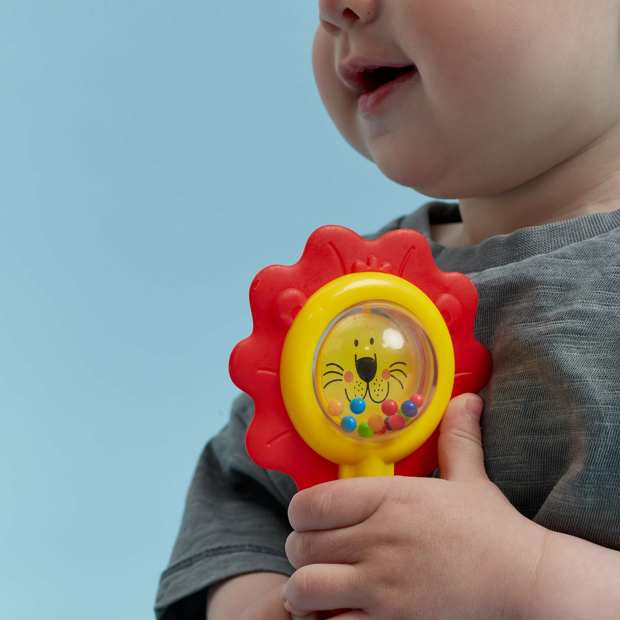 Дополняю отзыв после одного дня использования: погремушка довольно большая и тяжёлая для ручки трехмесячного малыша, лучше использовать взрослыми для успокоения или привлечения внимания, в руки ребенку не давать, чтобы не побил себя ей. Звук у погремушки мягкий приятный, не резкий, ребенка не пугает.