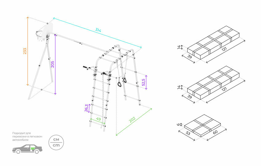 | В комплекте | гимнастические кольца, канатный лаз, качели, лестница, рукоход |