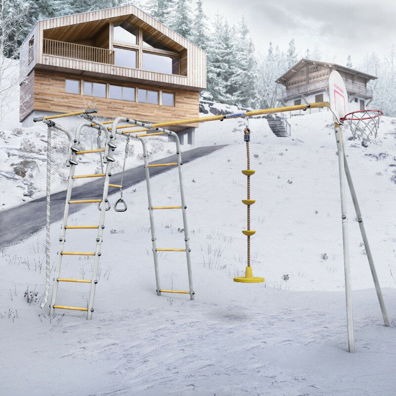 | Комплектация | кольца с перекладиной, веревочный лаз, гимнастическая лестница, рукоход, качели цепные |