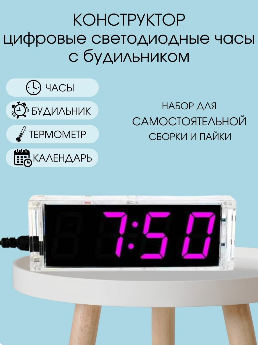 СохранитьНабор для самостоятельной пайки и сборки (конструктор) "Цифровые светодиодные часы - термометр / будильник розовые с корпусом" питание 5В (У) интересное: