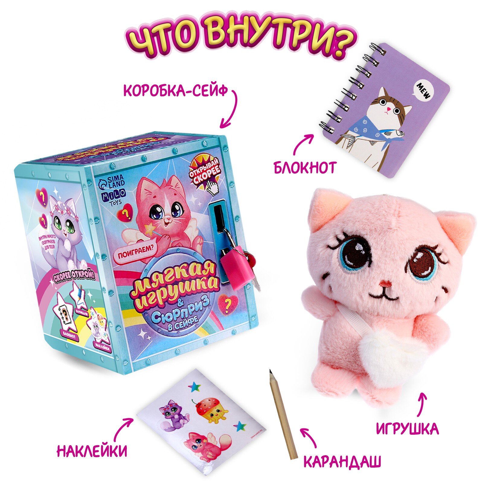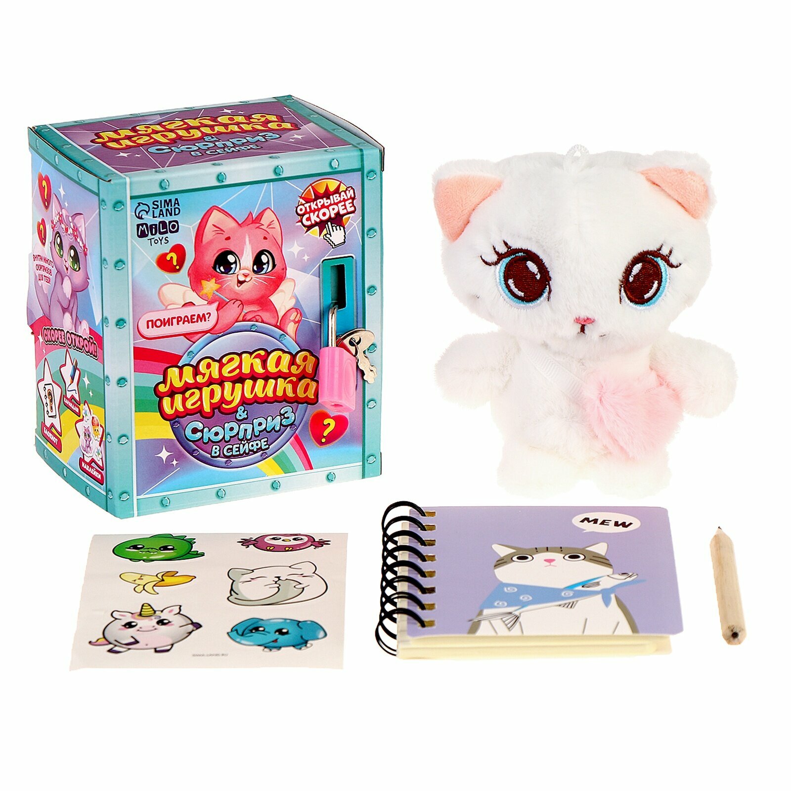 Купить Мягкая игрушка с сюрпризом "Кот" игрушка, блокнот, карандаш, наклейки, Milo toys