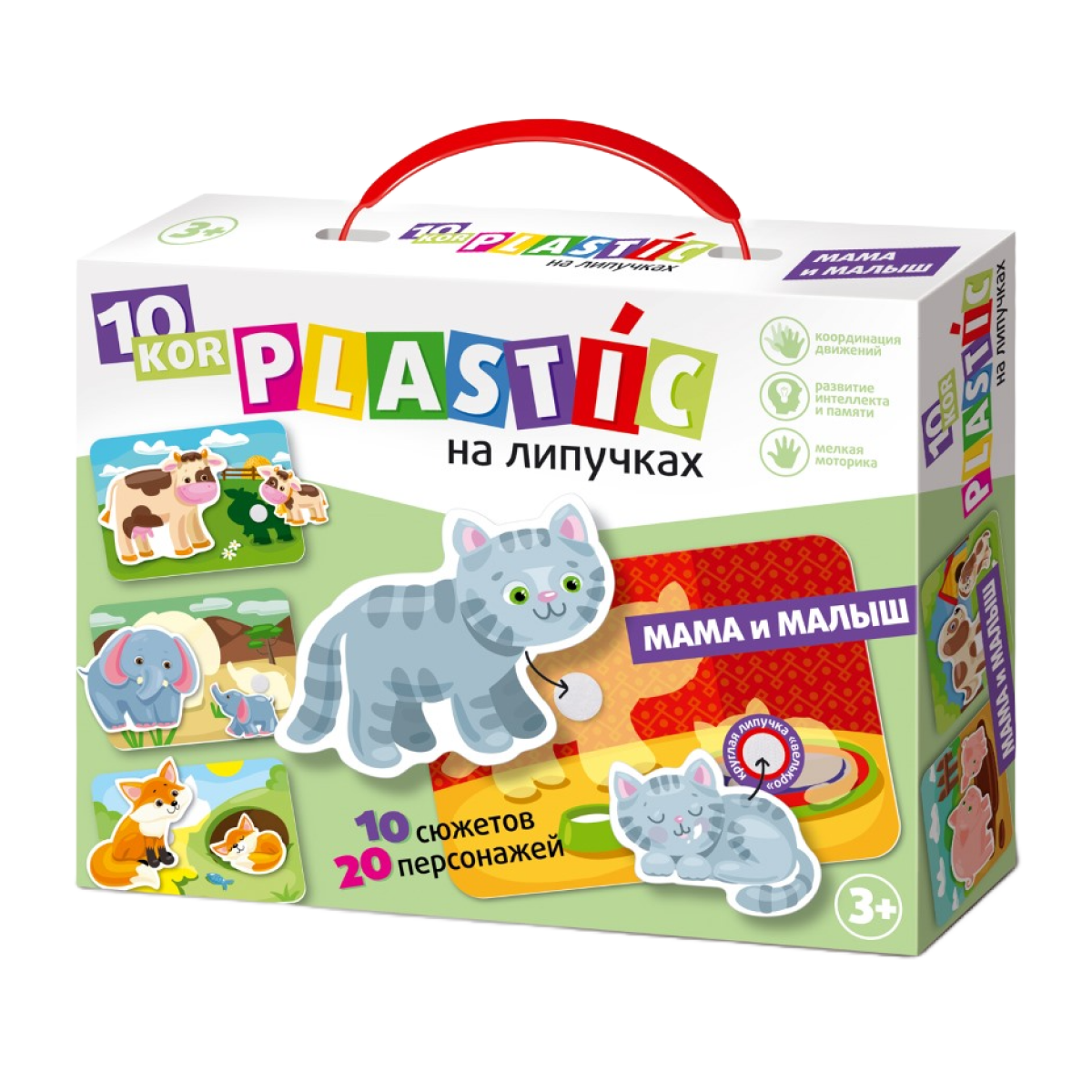 | Комплектация | - 10 пластиковых карточек (15,5х11см); - 20 пластиковых персонажей с липучками. |