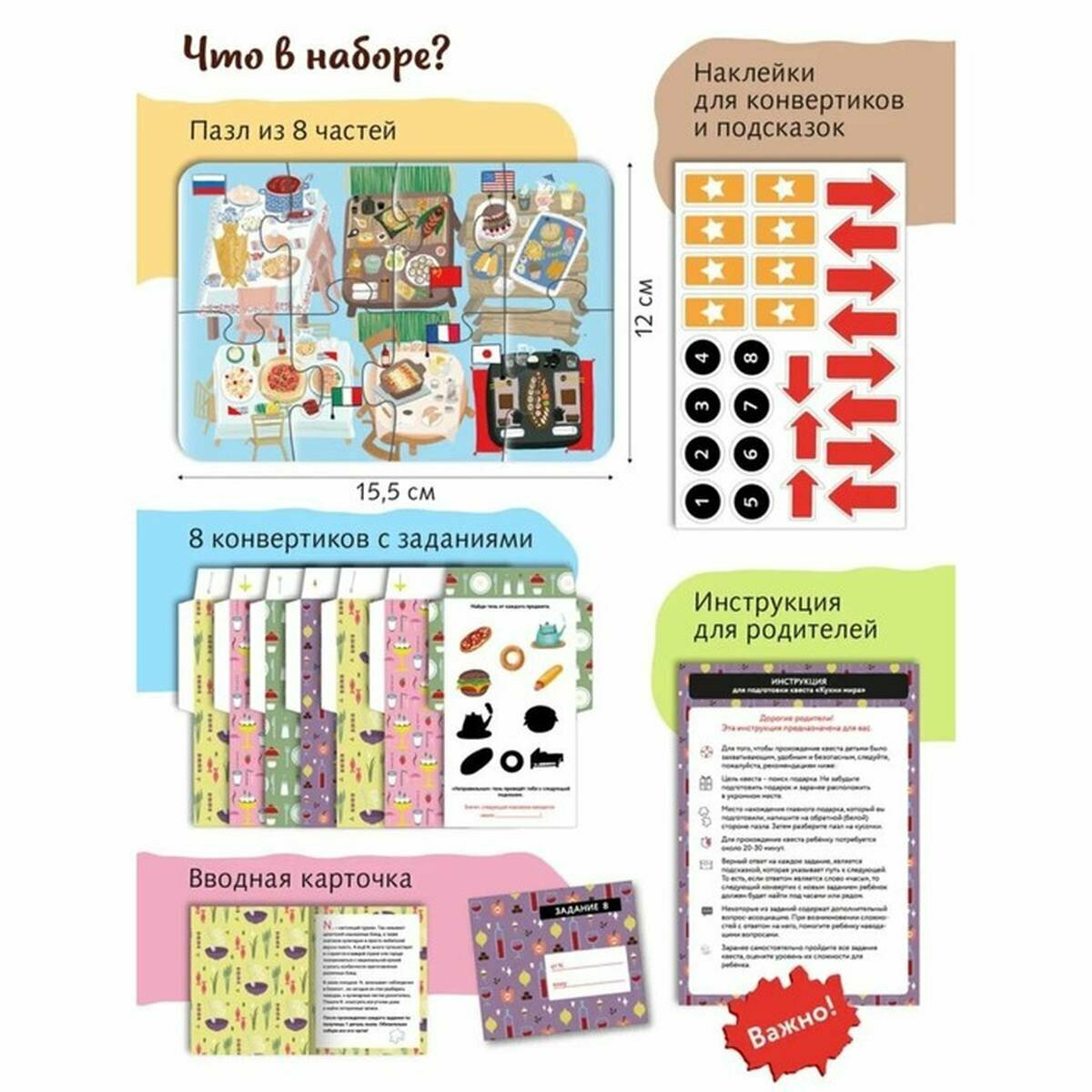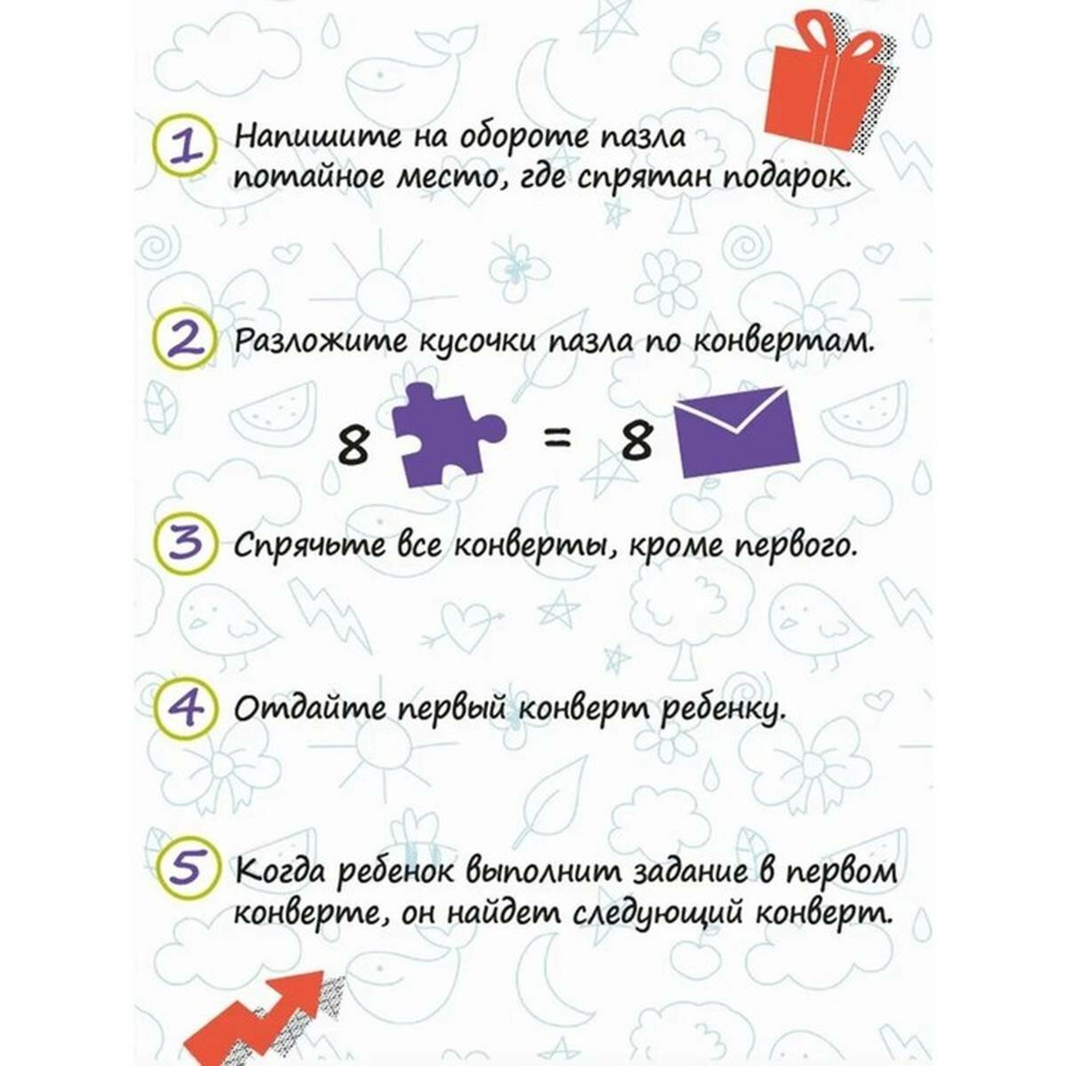 | Дополнительная информация | Для подготовки квеста понадобится всего 15 минут, В каждое письмо-конвертик нужно вложить один элемент пазла, Спрятать конвертики в места согласно инструкции, Для подсказок можно также использовать наклейки стрелочки и звездочки, |