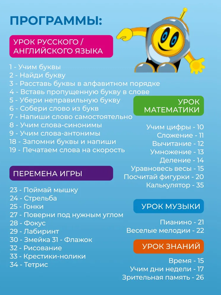 | Развиваемые навыки | иностранные языки, коммуникативные навыки, логика и мышление, музыкальный слух и чувство ритма, память и внимание, речь и чтение, самостоятельность, счет и математика |