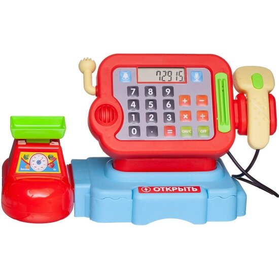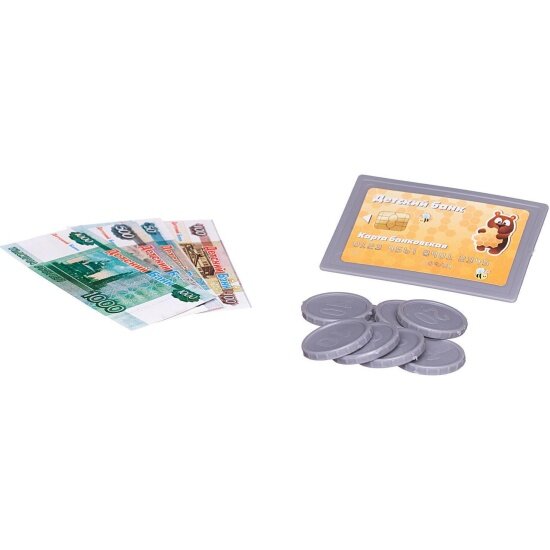 | Комплектация | кассовый аппарат с весами и сканером / банковская карта / комплект игрушечных денег |