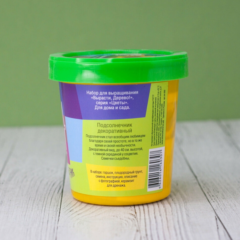 | Комплектация | пластиковый горшок с крышкой объемом 0,5 литра, крышка-поддон для избытка влаги, семена подсолнечника, плодородный грунт (PH=5,5-6,5), керамзит |