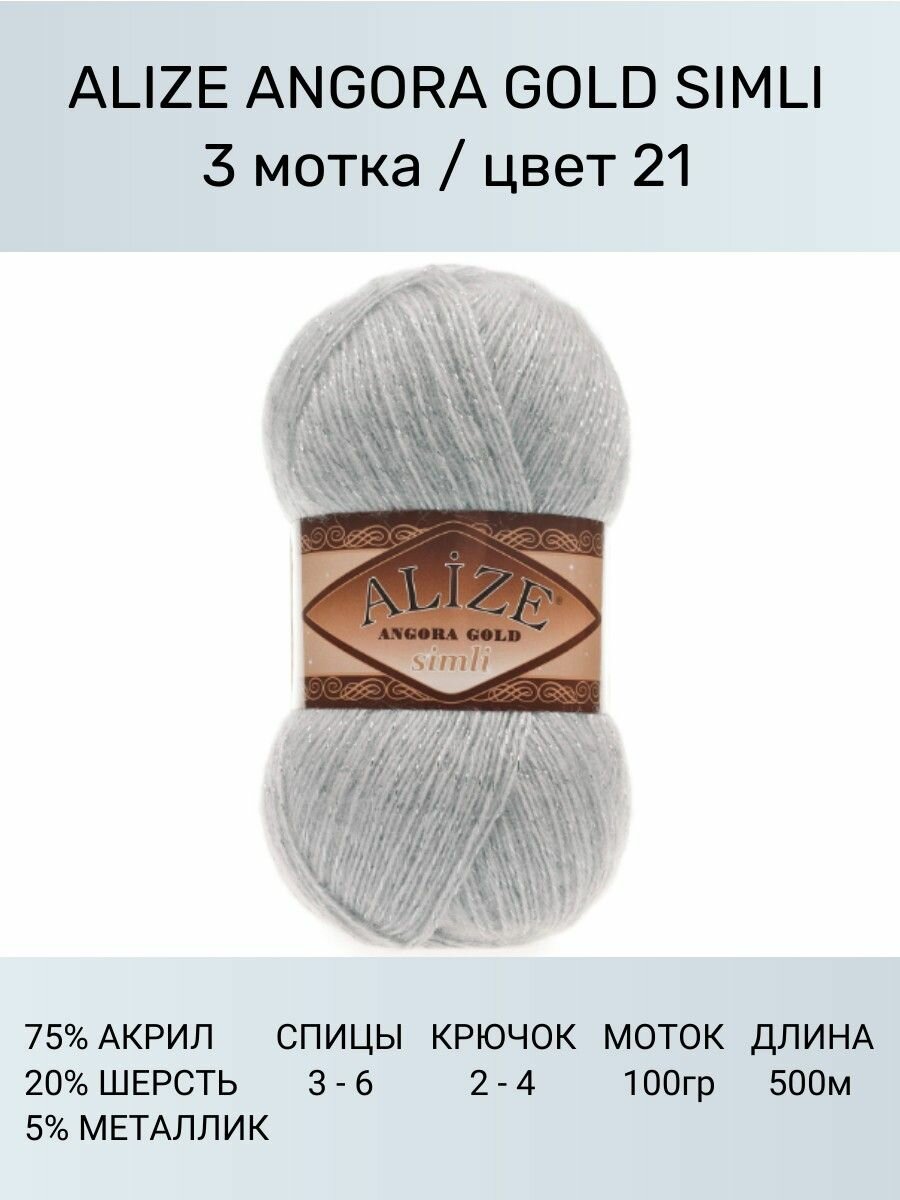 Купить Пряжа для вязания ALIZE Angora Gold Simli Ализе Ангора Голд: 21 (серый), 3 шт 500 м 100 г, 5% металлик, 20% шерсть, 75% акрил
