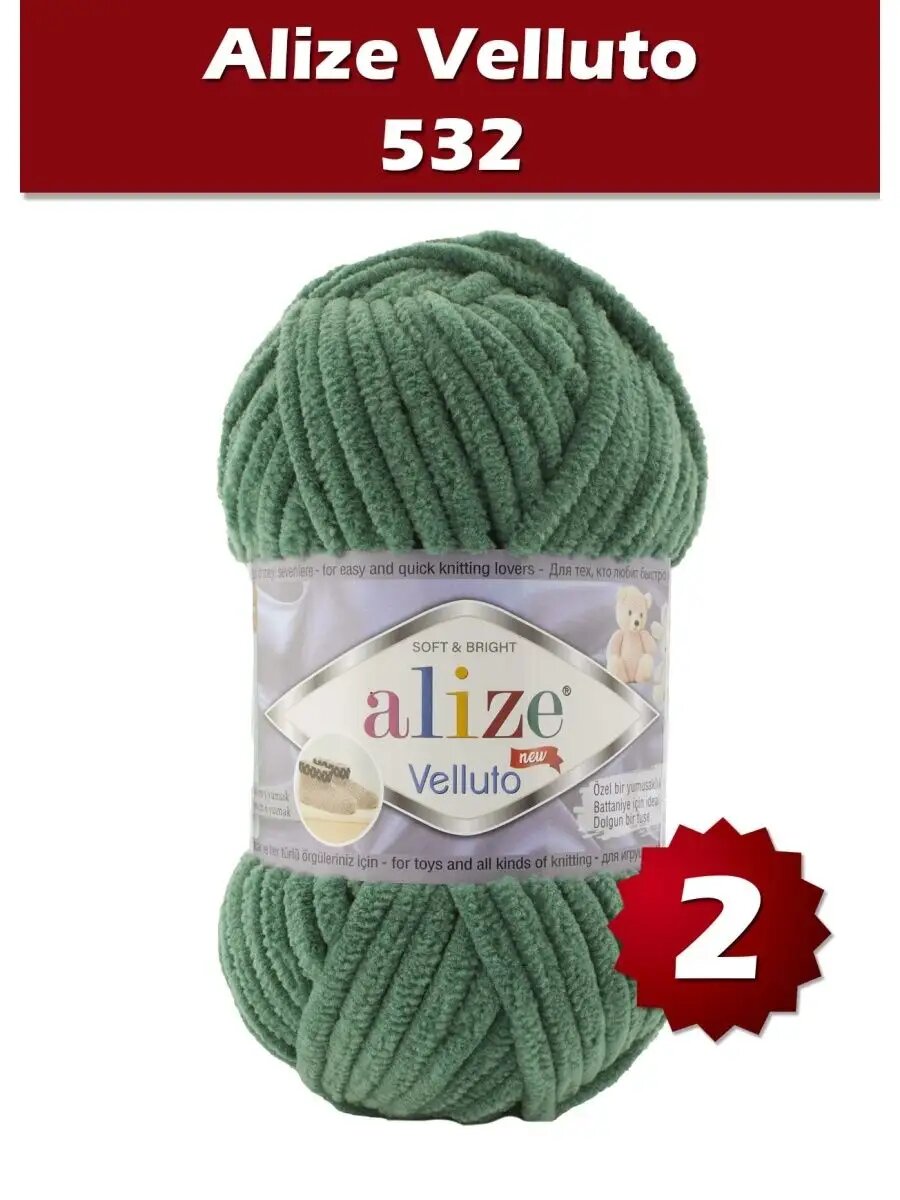 Плюшевая пряжа Alize Veluto 532(хвойный) , 2шт,100г. 68 м.