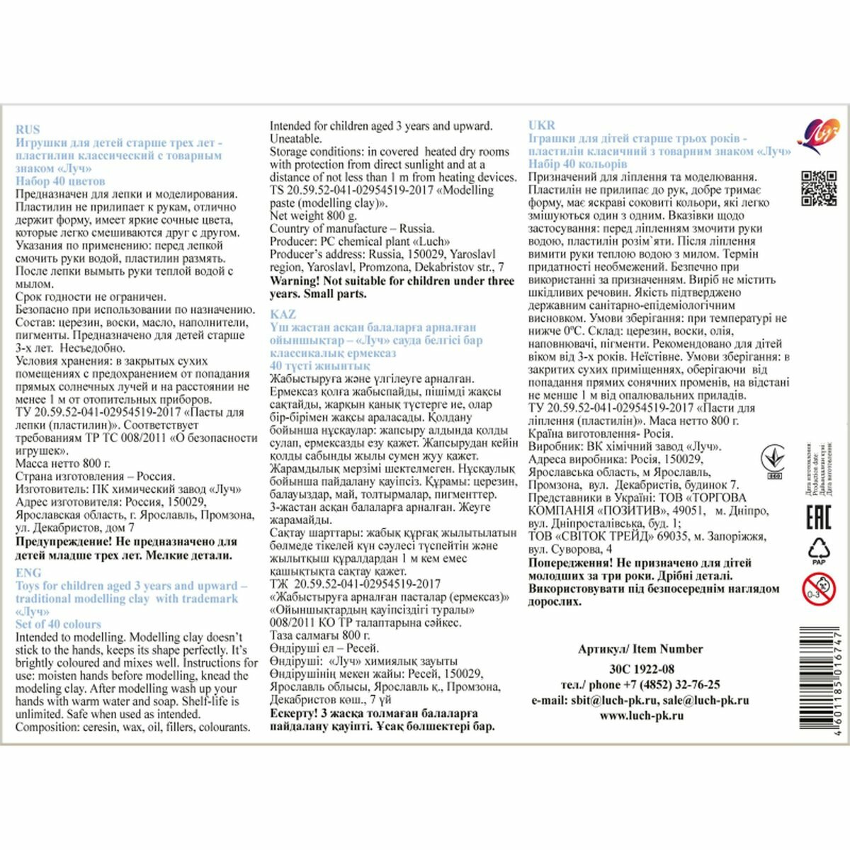 Пластилин 40 цветов Луч "Классика", 800г, со стеком (30С 1922-08), 6 уп. интересное: