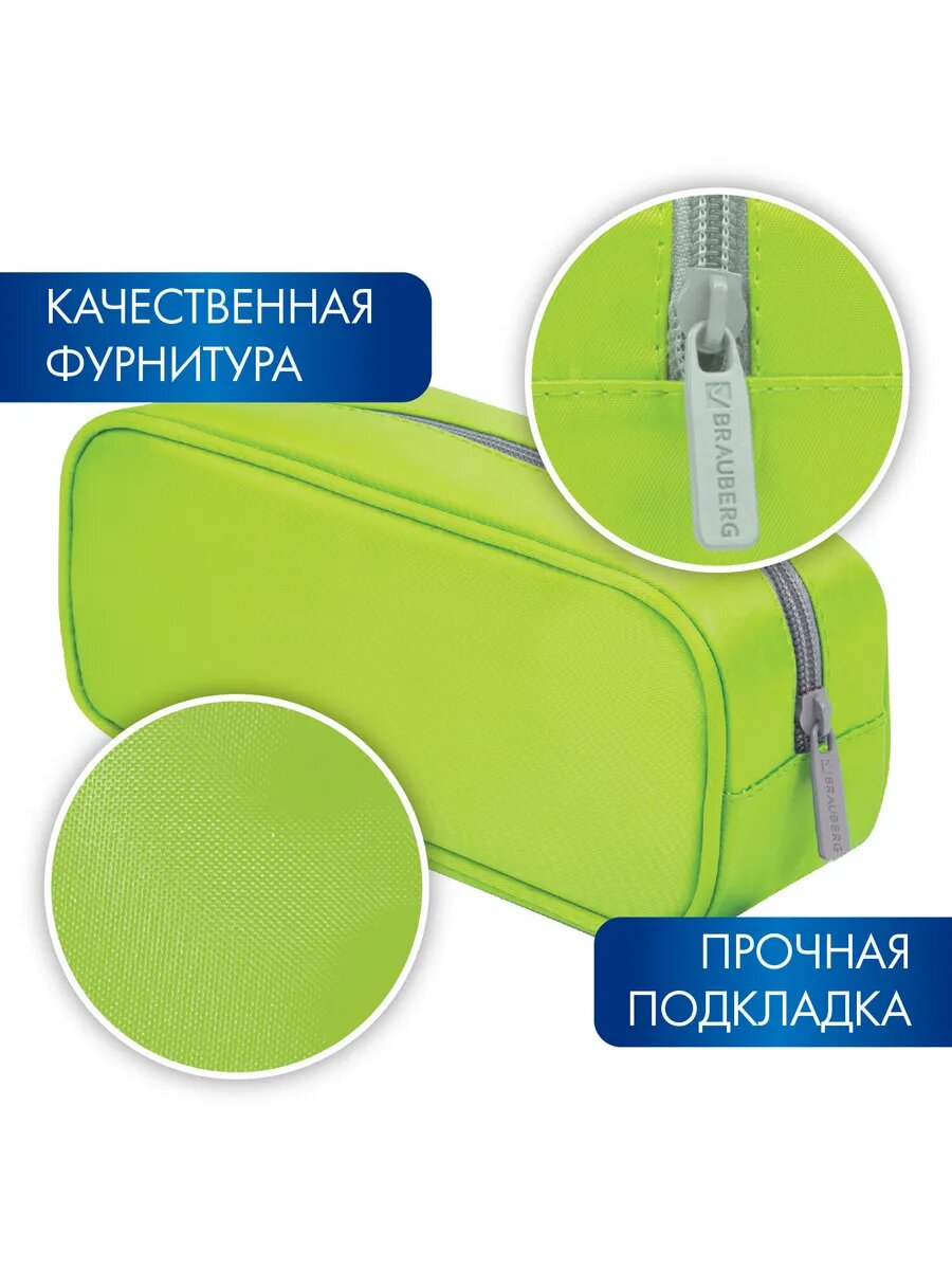 Пенал-косметичка школьный для ручек, карандашей для мальчика/девочки/подростка Brauberg, мягкий, King Size Neon Green, 20х8х9 см, 229020